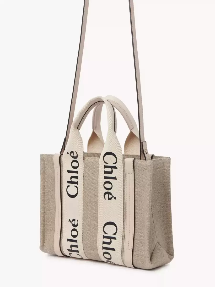 Crafted from linen canvas detailed with shiny calfskin strips, this small Woody tote bag is a soft day bag with a removable long strap in addition to the top handles. The roomy inside compartment is unlined and includes a practical flat pocket in leather for an elevated touch. Carry this versatile small bag on the arm, shoulder or cross-body.