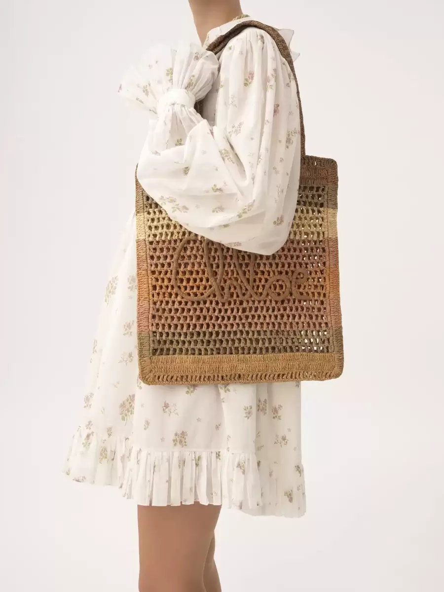 The Summer Banana tote bag was crafted from multicolor raffia by a single artisan over 4.5 days in collaboration with Made For A Woman. The front features a handwritten signature inspired by the Chloé heritage.