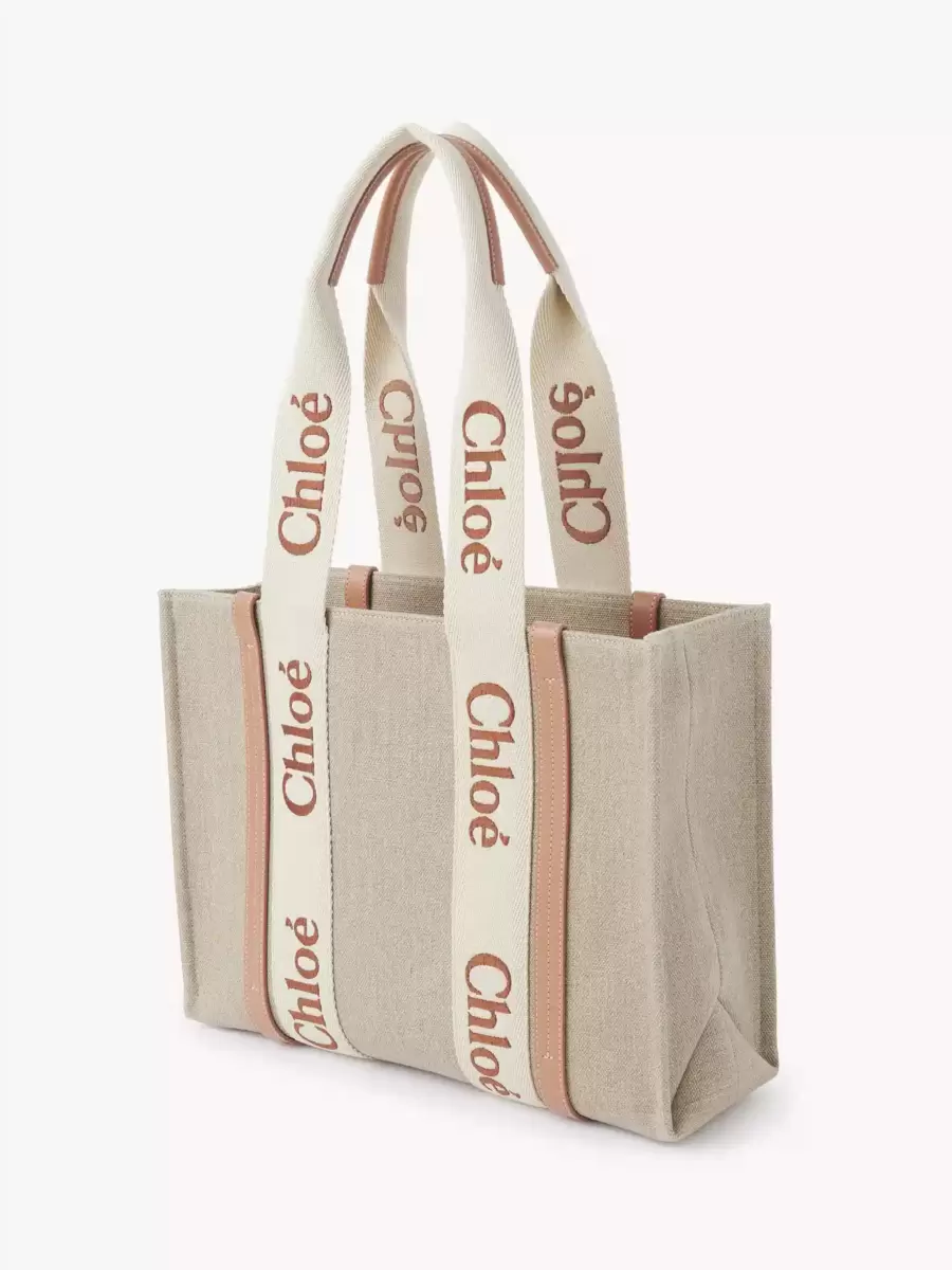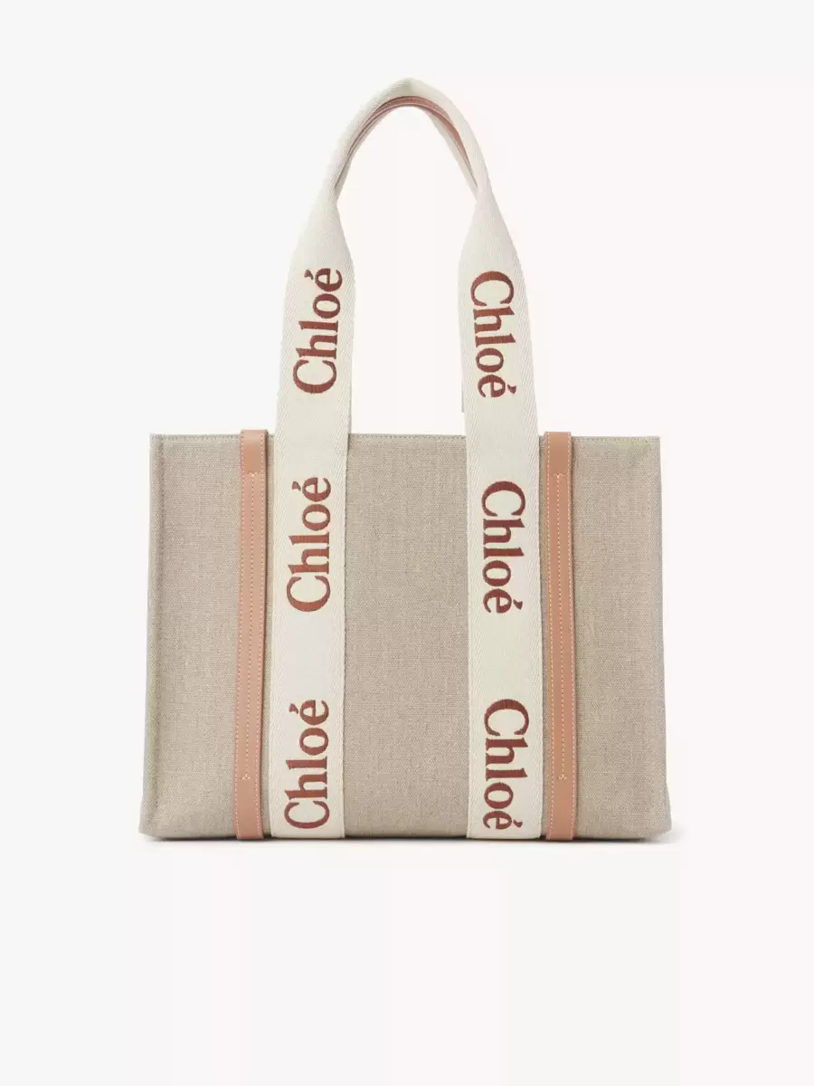 Woody tote bag in linen canvas, calfskin & webbing with Chloé logo embroidery