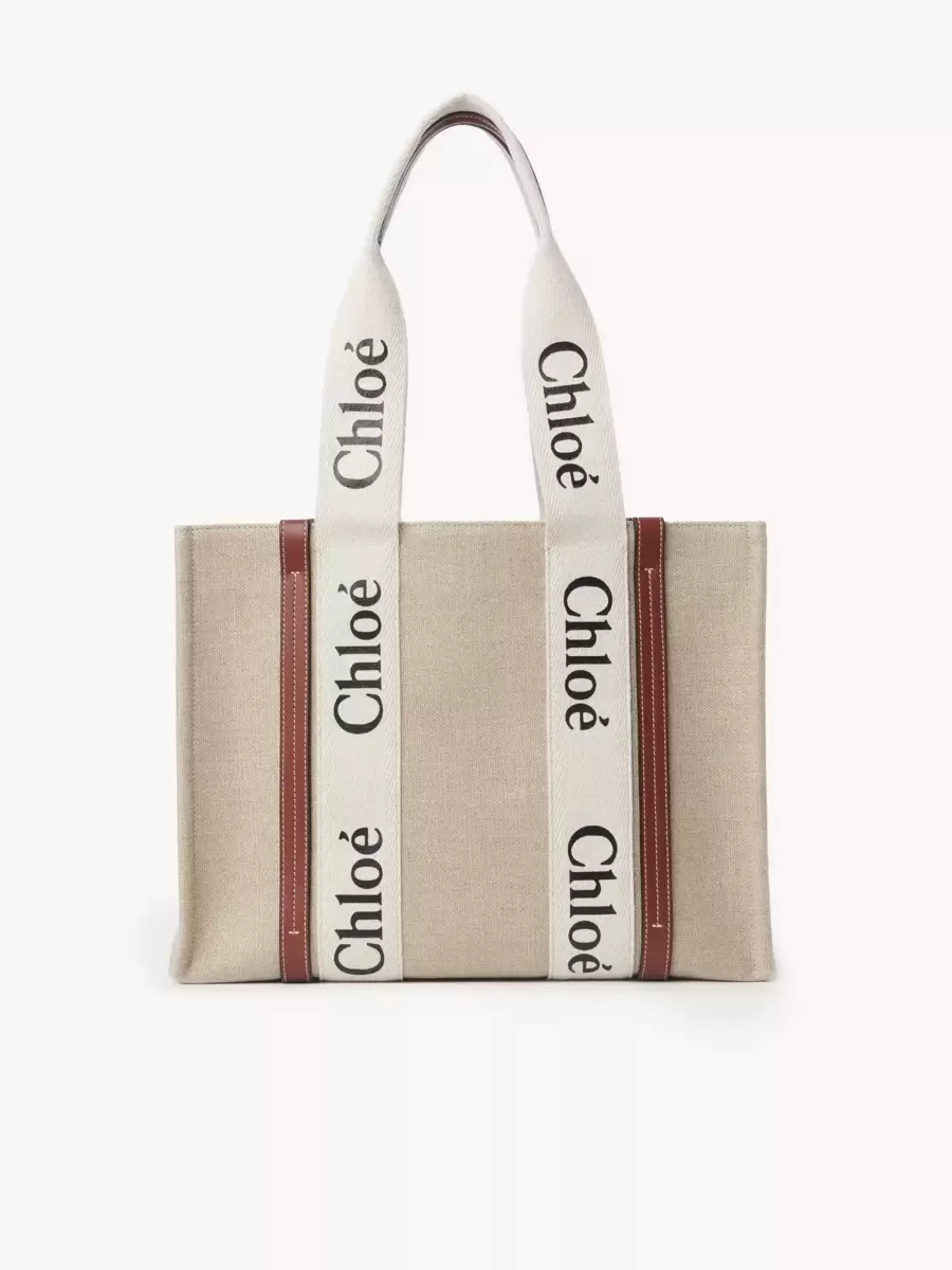 Crafted from lower-impact linen canvas detailed with shiny calfskin strips, this medium Woody tote bag is a spacious bag with a strong summer attitude. The roomy inside compartment includes a practical flat pocket.