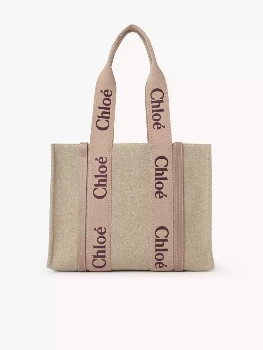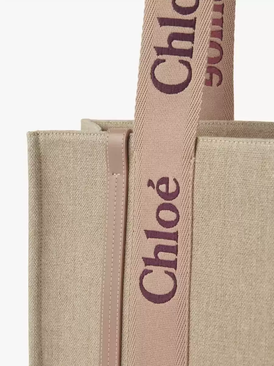 Woody tote bag in linen canvas, calfskin & webbing with Chloé logo embroidery