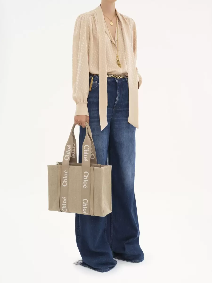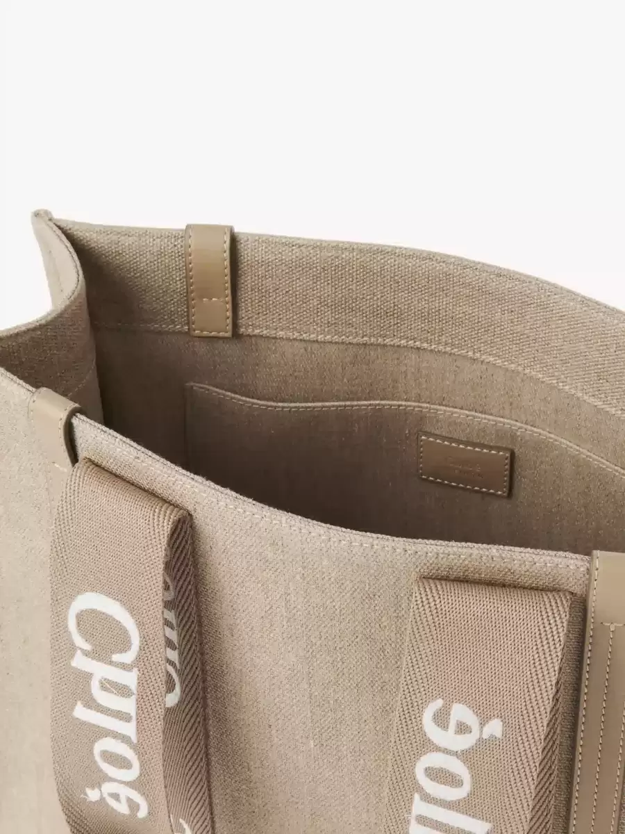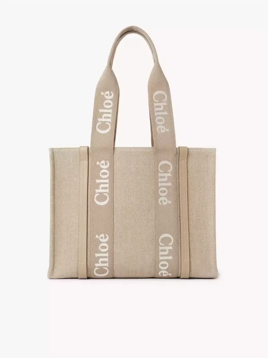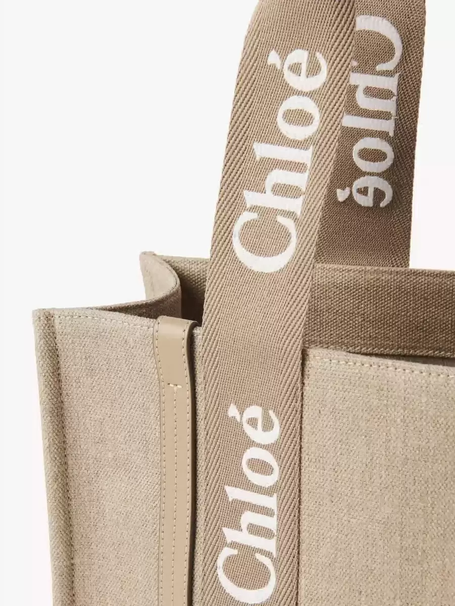 This Woody tote bag is crafted from linen canvas, elevated by contrasting vertical strips in shiny calfskin and signature canvas ribbons embroidered with the Chloé logo. Carry on the shoulder or in the hand with the double handles.