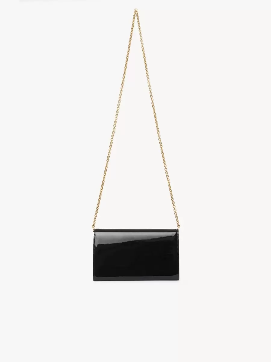 Crafted from patent calfskin, the Chloé Iconic flap wallet on chain combines a minimalist silhouette with a metallic signature from the Maison’s archives.