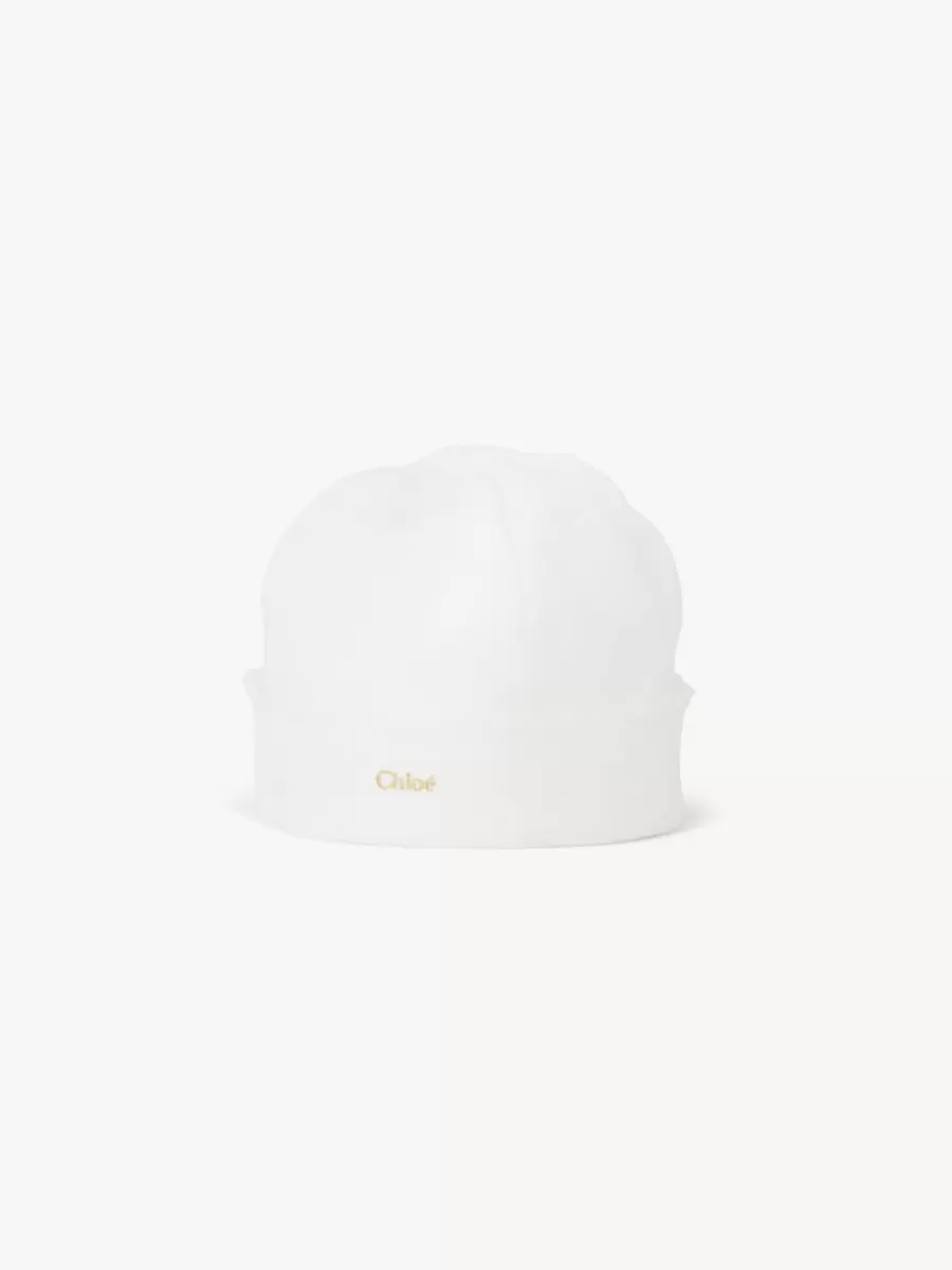 The pajamas feature a scalloped trim through the front and at the chest pocket, echoed along the hem of the turn-up hat. A gold-tone Chloé logo print signs both pieces.