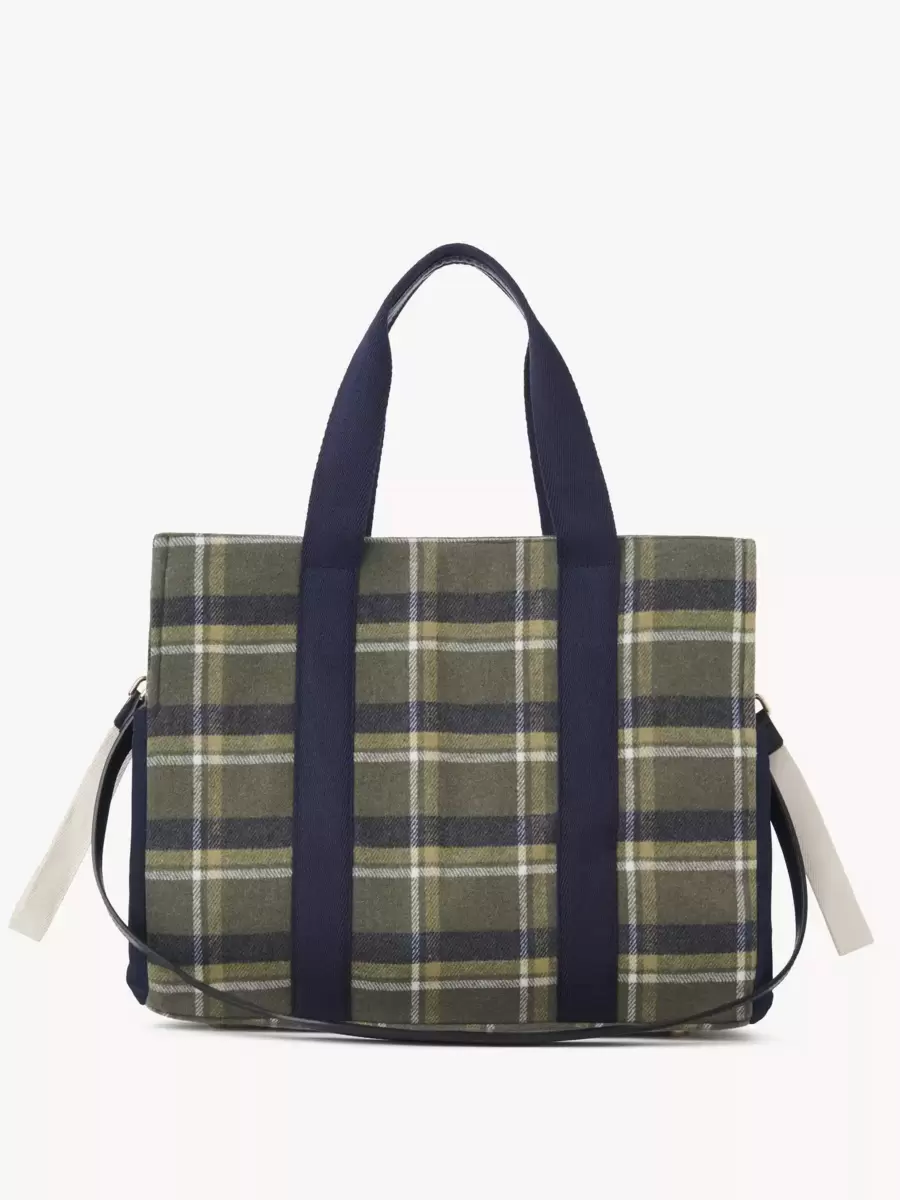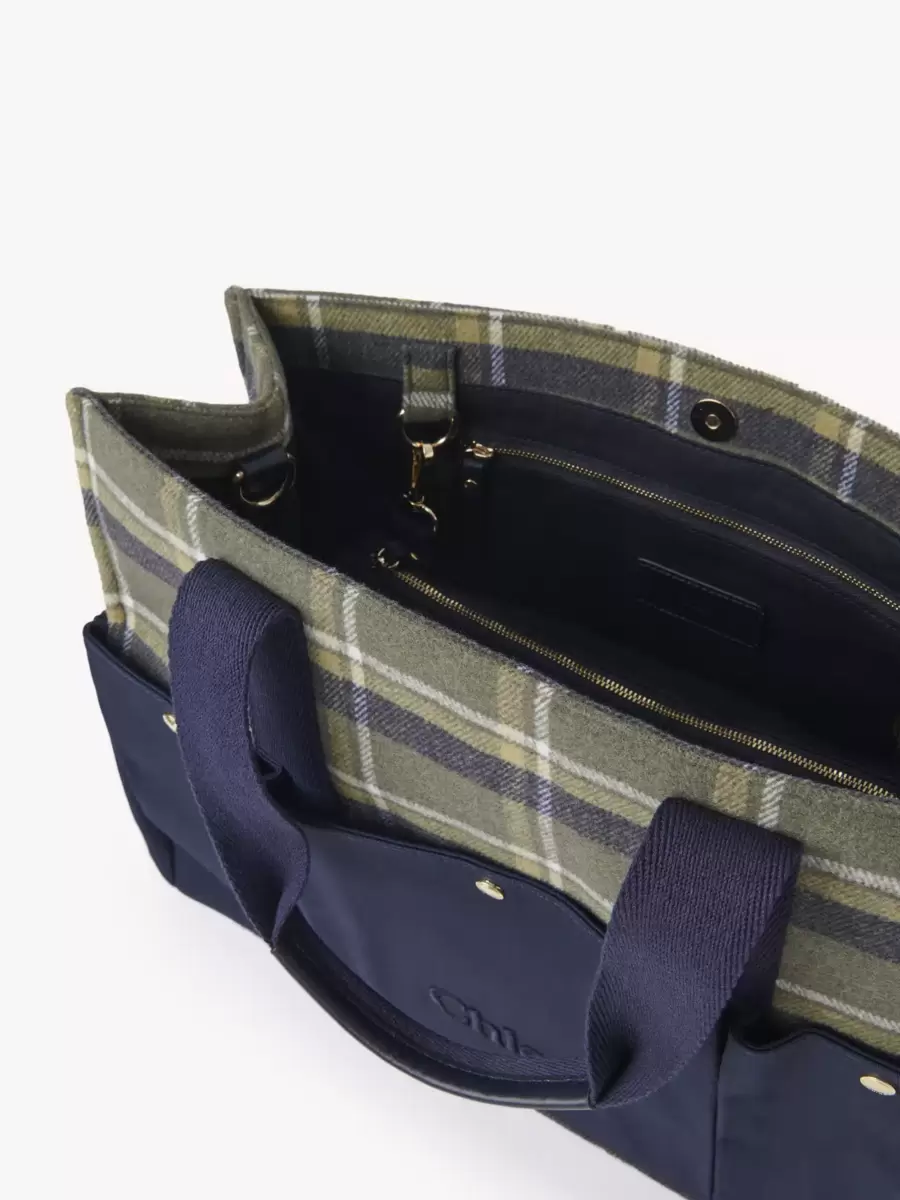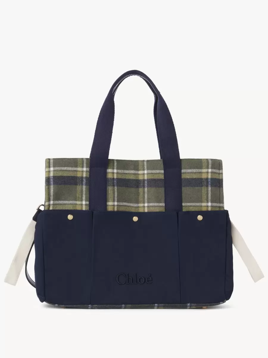A practical accessory for parents, this Chloé changing bag combines a check and plain fabric with leather trims and a long, removable strap. Multiple pockets, stroller clips, a removable zipper pouch and a changing mat make this a multi-purpose bag. Gold-tone hardware and Chloé logo embroidery sign this piece.