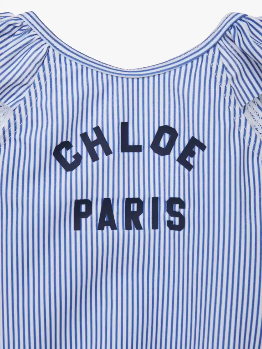 This striped one-piece swimsuit combines ruffled shoulders and a scoop back with a contrast Chloé Paris logo print at the front.