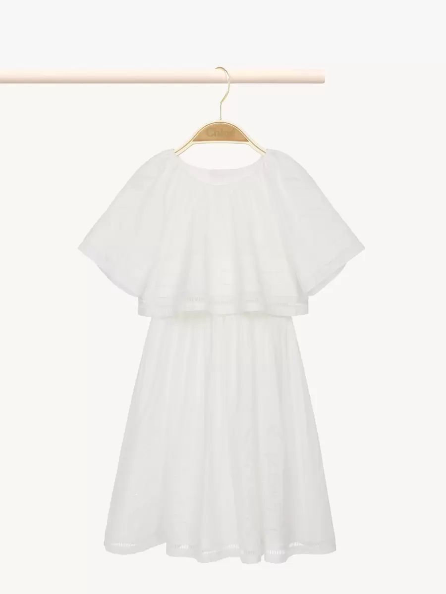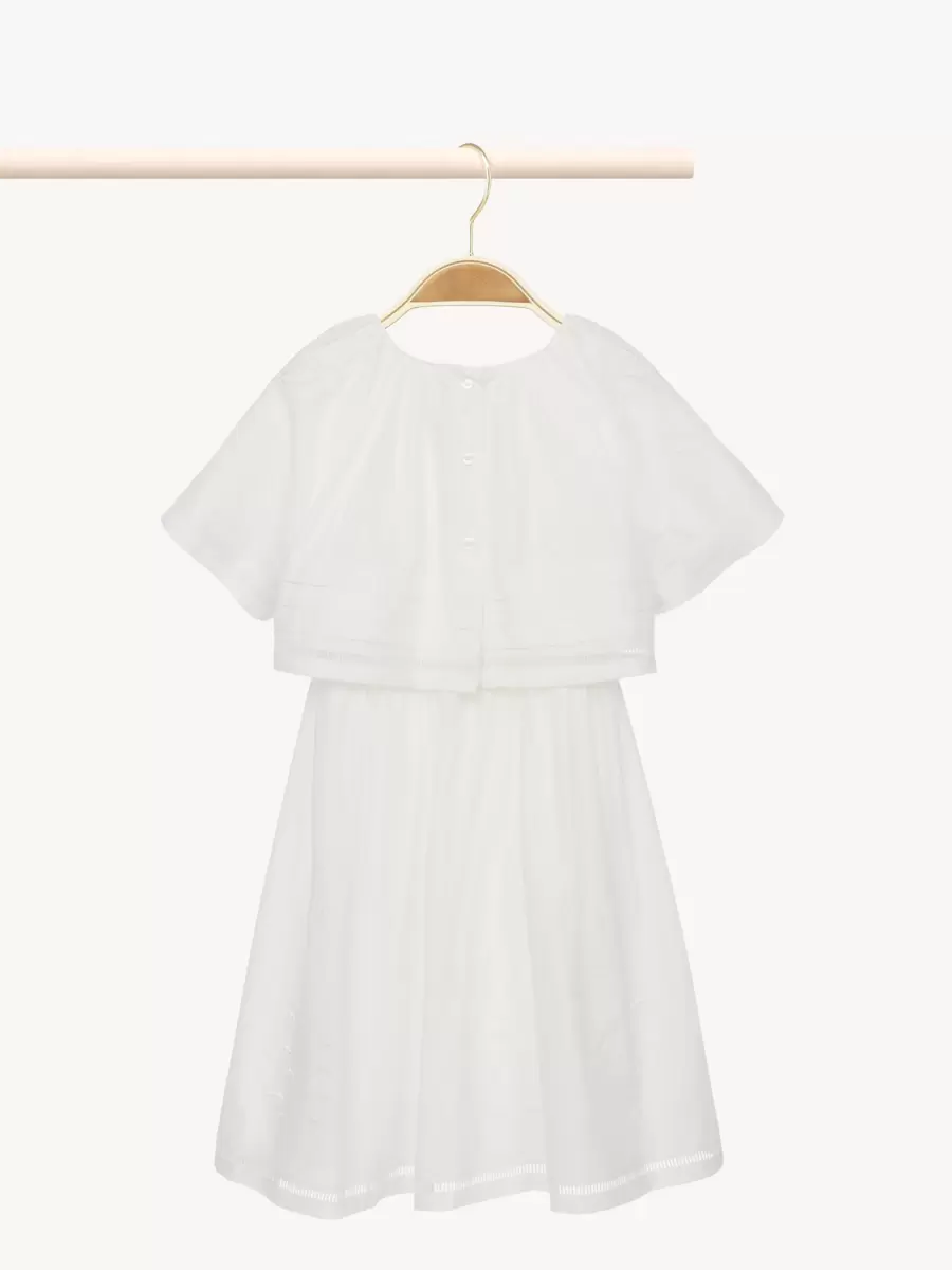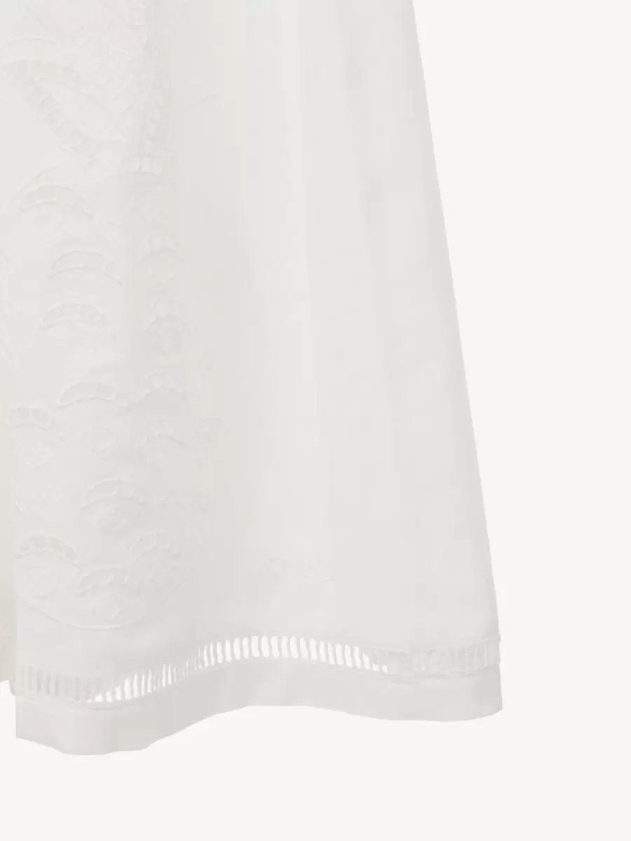 Crafted from organic cotton percale, this short-sleeve long dress combines a fluid, buttoned top with a flared skirt. The gathered white dress features openwork pineapple embroidery and jour échelle trims, along with pleated detail along the top. Tonal Chloé logo embroidery signs this piece.