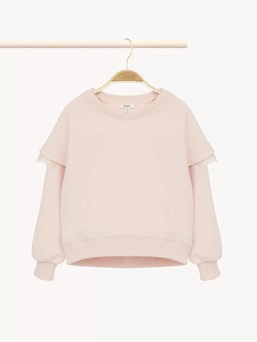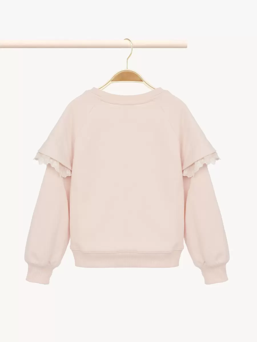 This organic cotton sweater elevates soft, comfortable fleece with a scalloped ruffle embellished with flower embroidery at the sleeves. The relaxed, crew-neck silhouette is finished with ribbed trims.