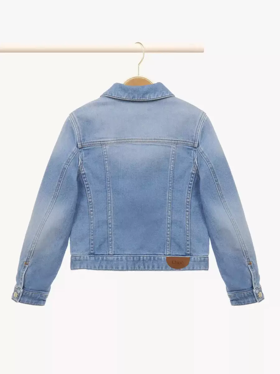 This cotton denim jacket has a faded effect and ochre top-stitching for a city attitude. Gold-toned Chloé-engraved snap buttons run through the front and detail the chest pockets, adding elegant hardware. A Chloé Paris leather logo patch signs the back.