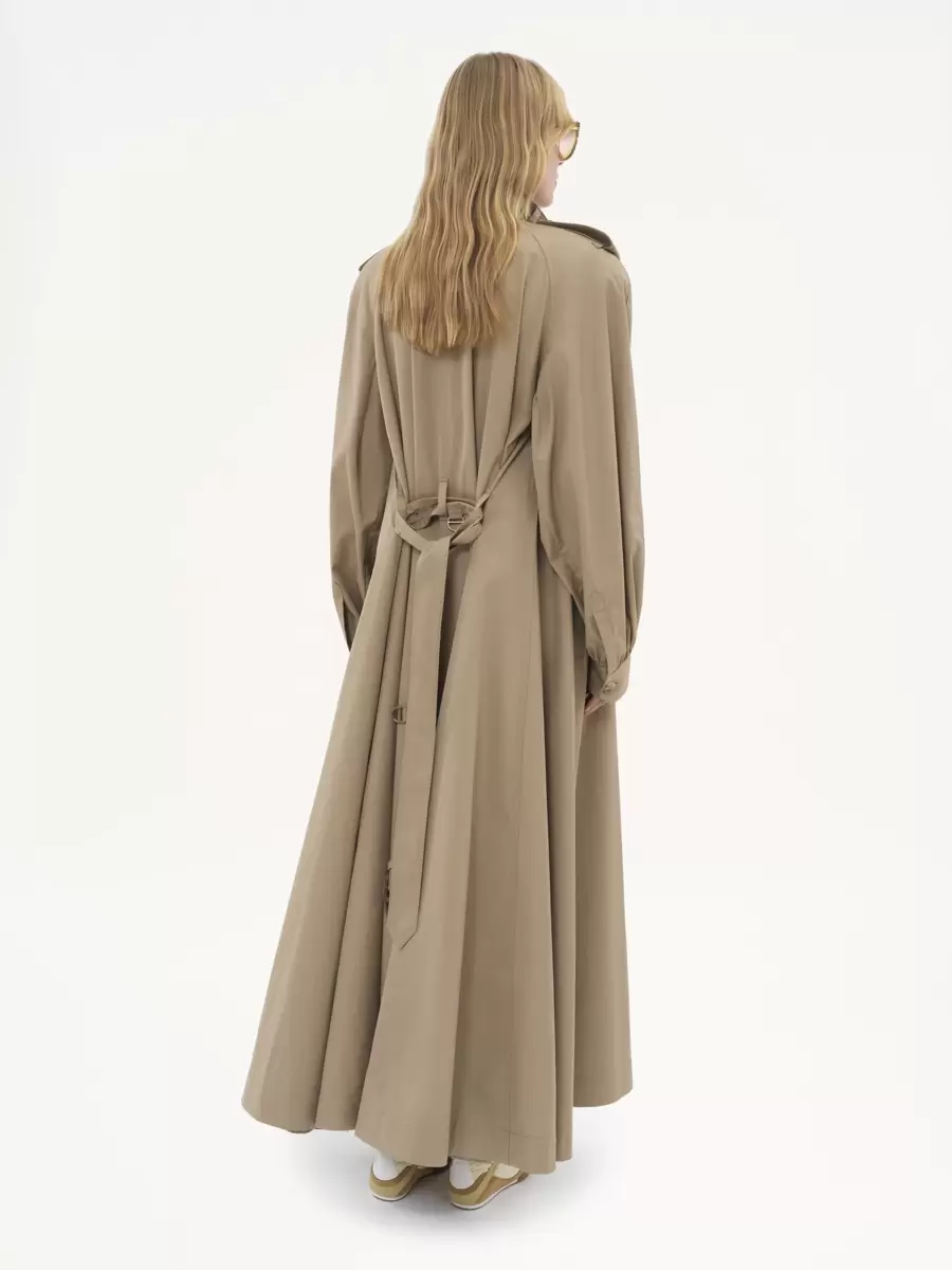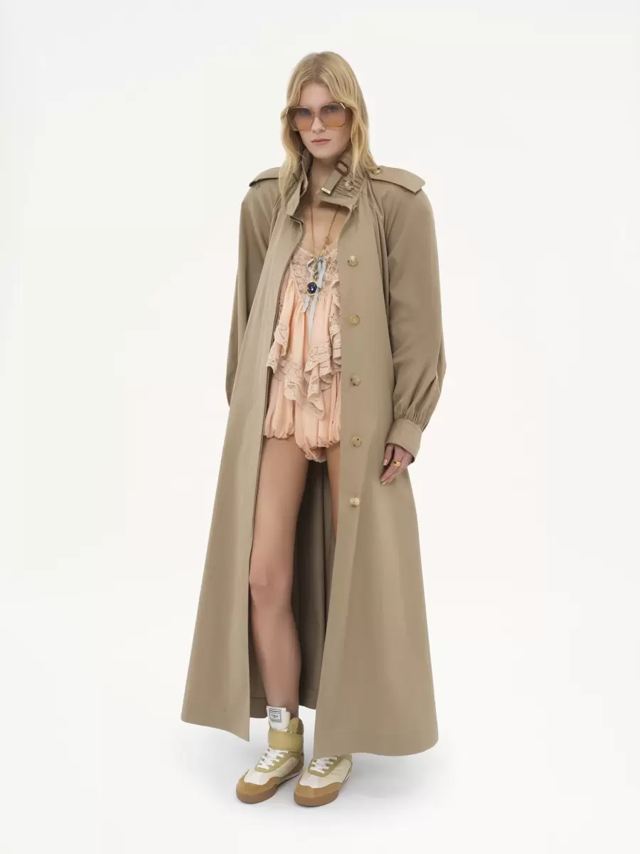 High-neck long trench coat in light organic cotton gabardine, featuring engraved horn buttons, a removable belt and gathered cuffs. Leather buckles and shoulder tabs finish this piece.