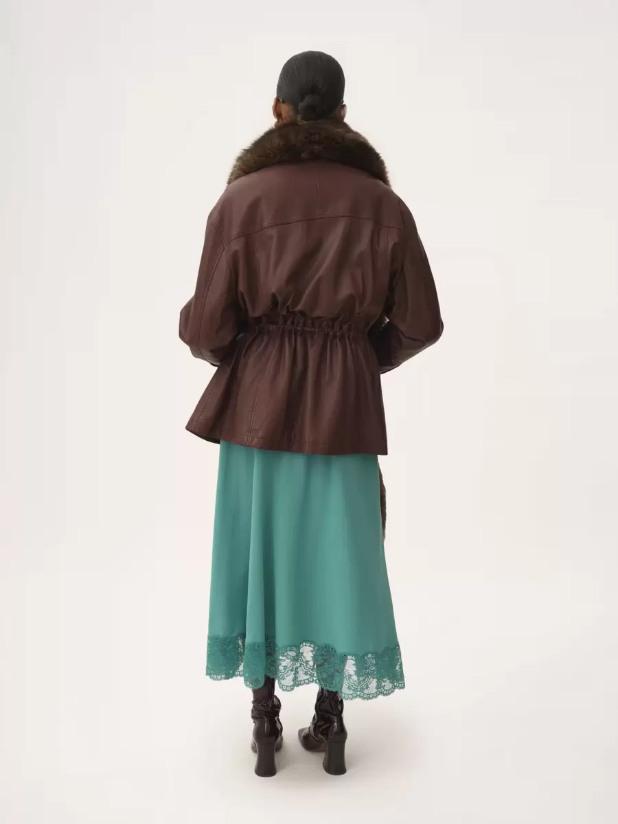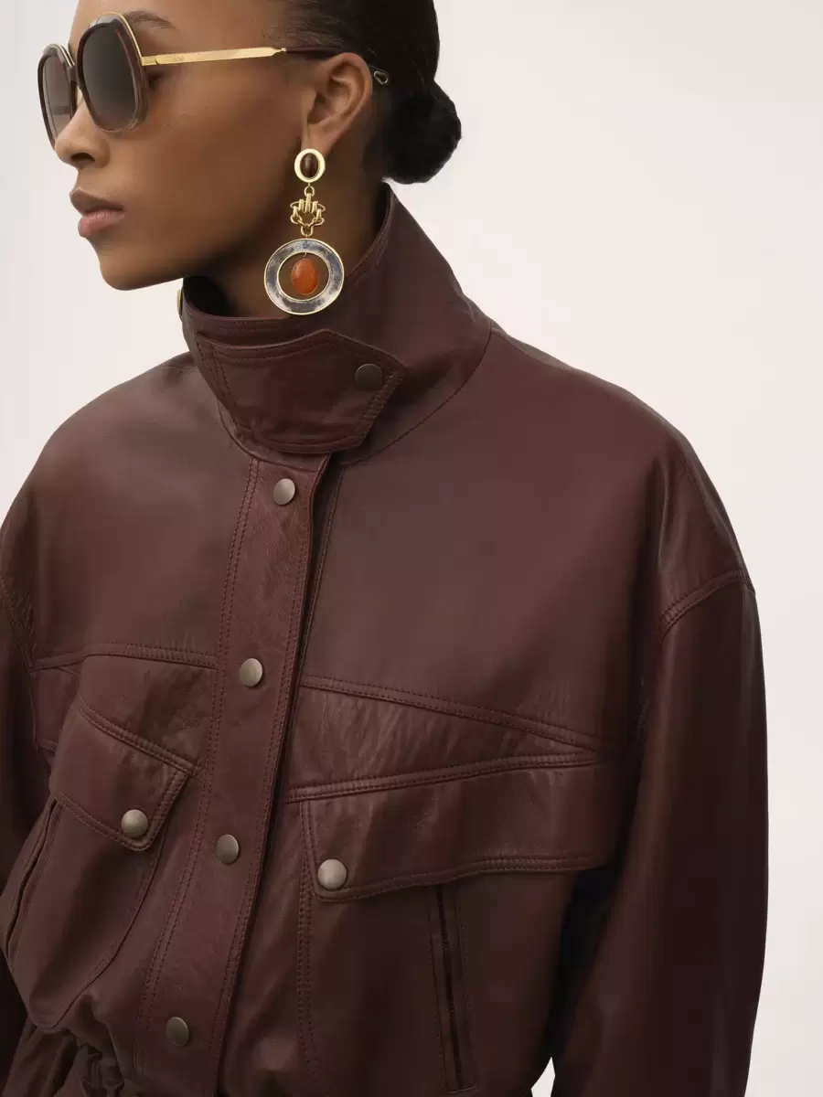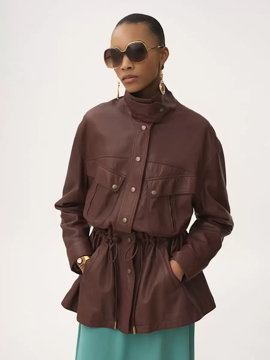 High-neck parka in classic plongé leather, featuring a chin-strap collar, oversized pockets, an elasticated drawstring waist and gold-tone snap buttons.