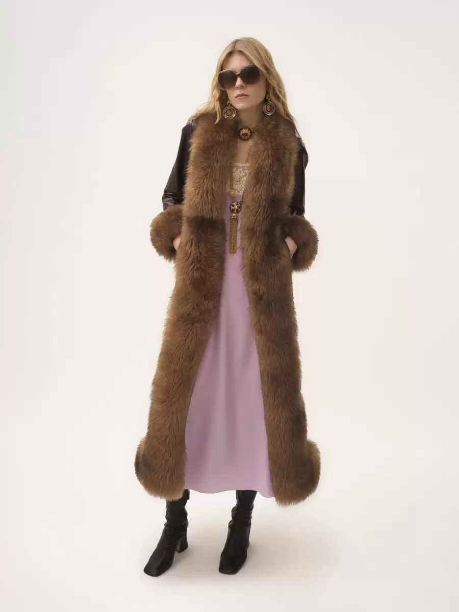 Long column coat in shiny cowhide with contrast shearling trims, a tonal leather belt with decorative, gold-tone hardware, and concealed horn buttons.