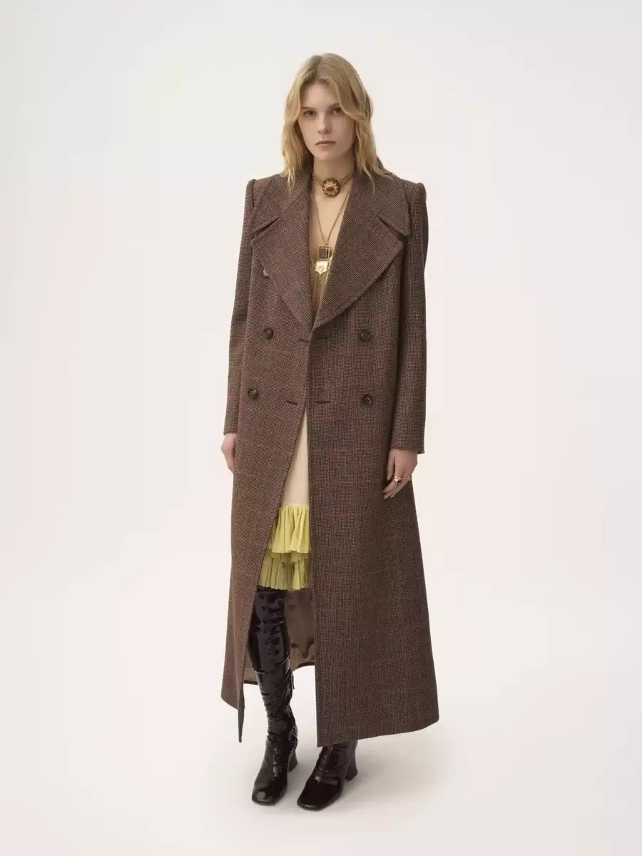 Long double-breasted coat tailored from lower-impact check wool, finished with horn buttons.