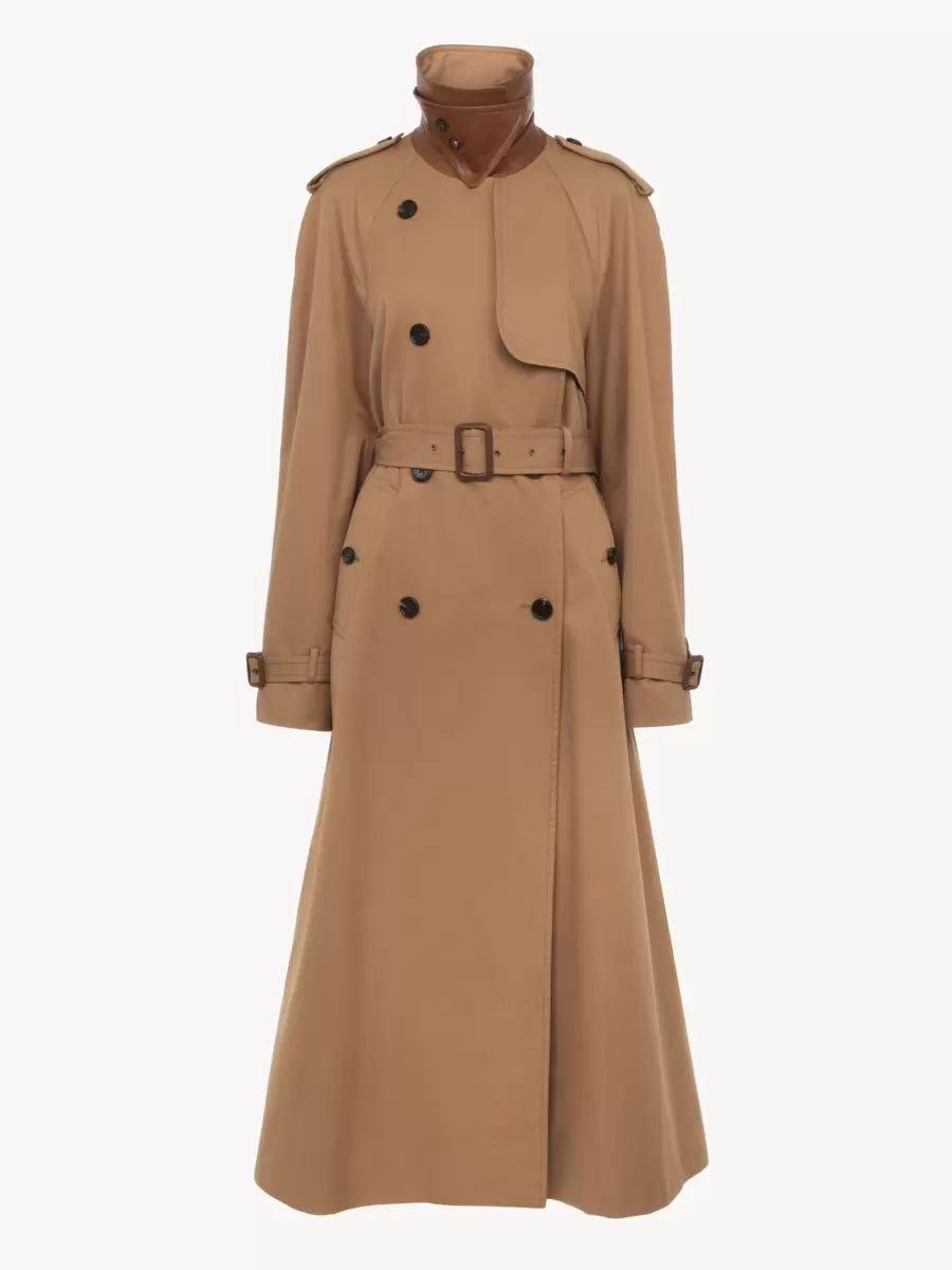 Long trench coat in cotton gabardine, featuring engraved horn buttons, a lambskin-trimmed chin-strap collar and a removable buckled belt. A storm flap, shoulder tabs and cuff tabs finish this piece.