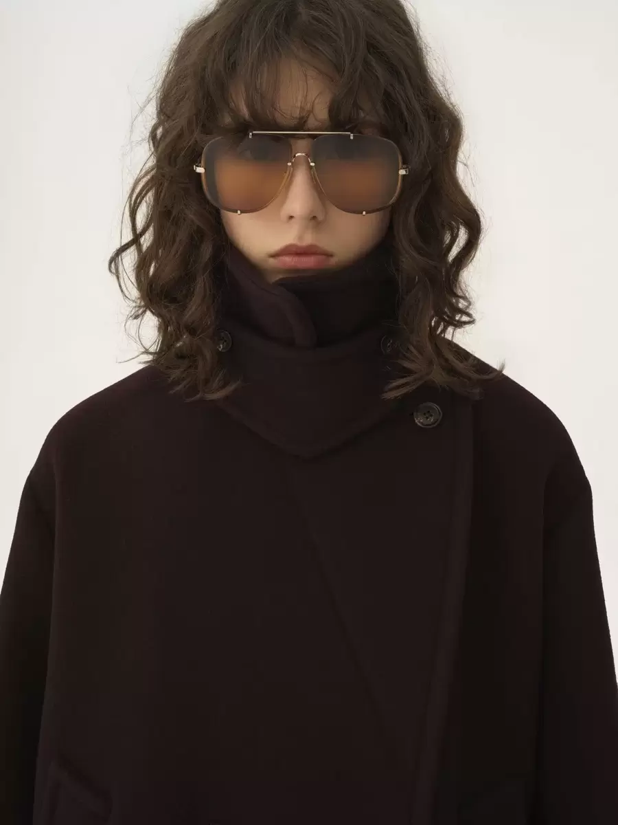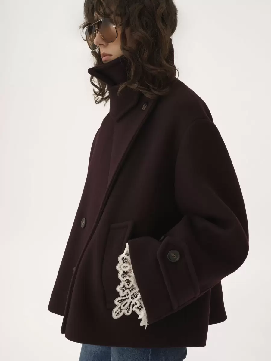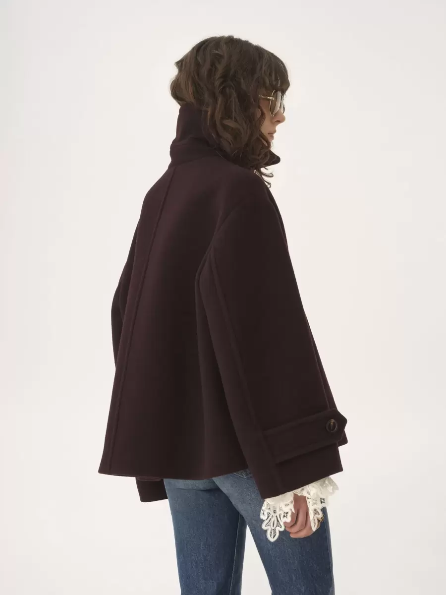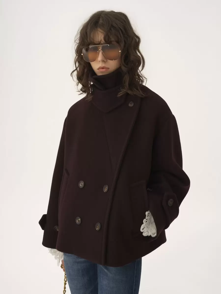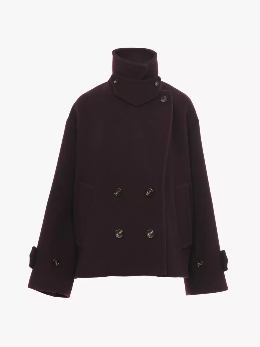 Double-breasted oversized short coat in iconic soft wool with a chin-strap collar and engraved horn buttons.