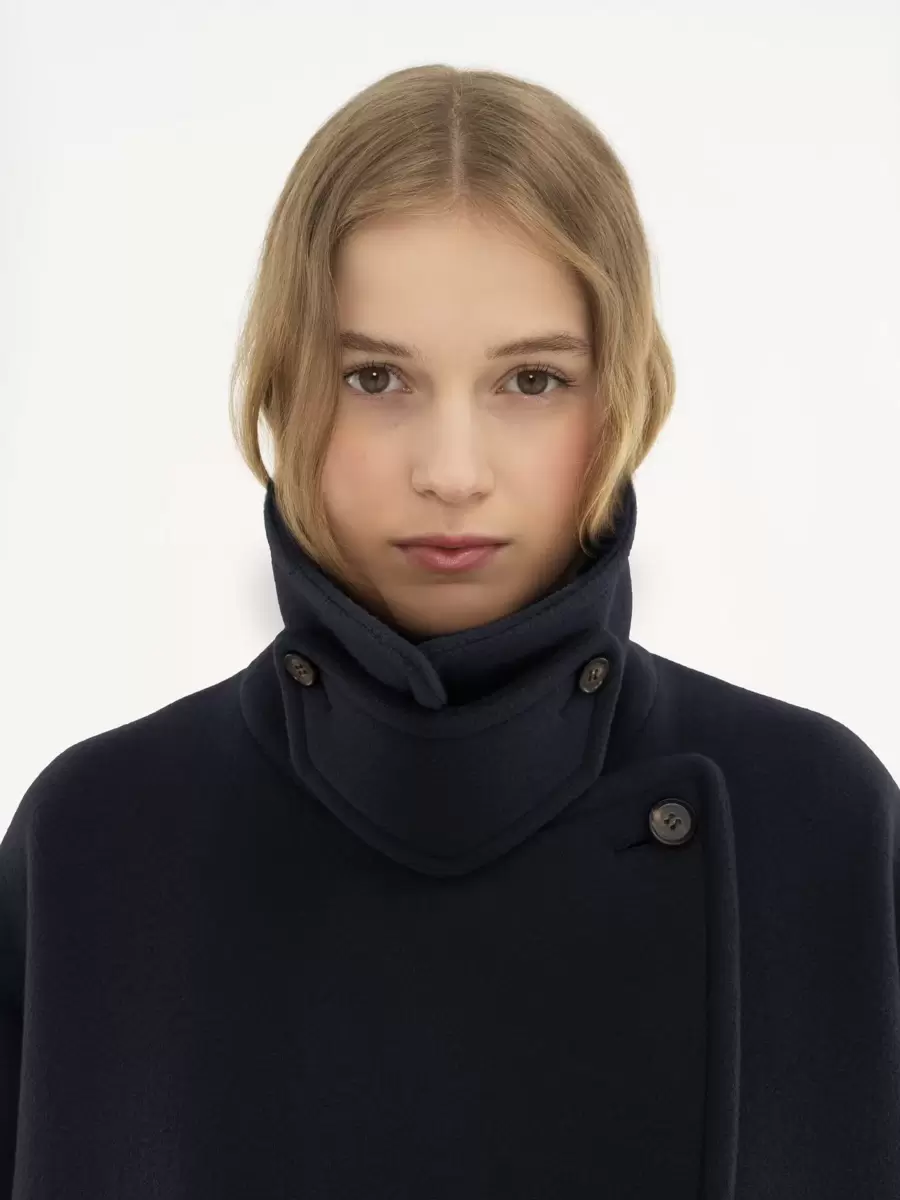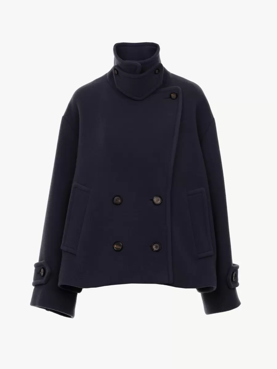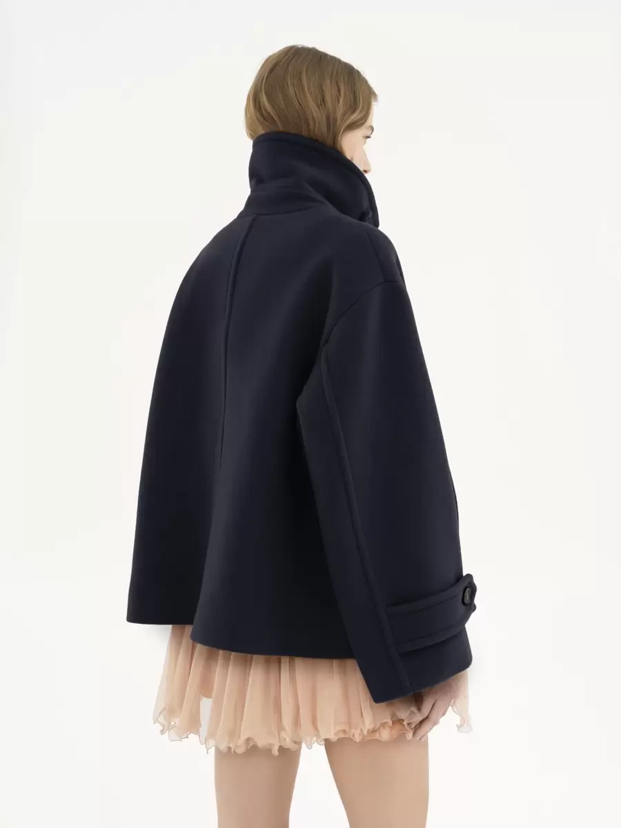 Double-breasted oversized short coat in iconic soft wool with a chin-strap collar and horn buttons.