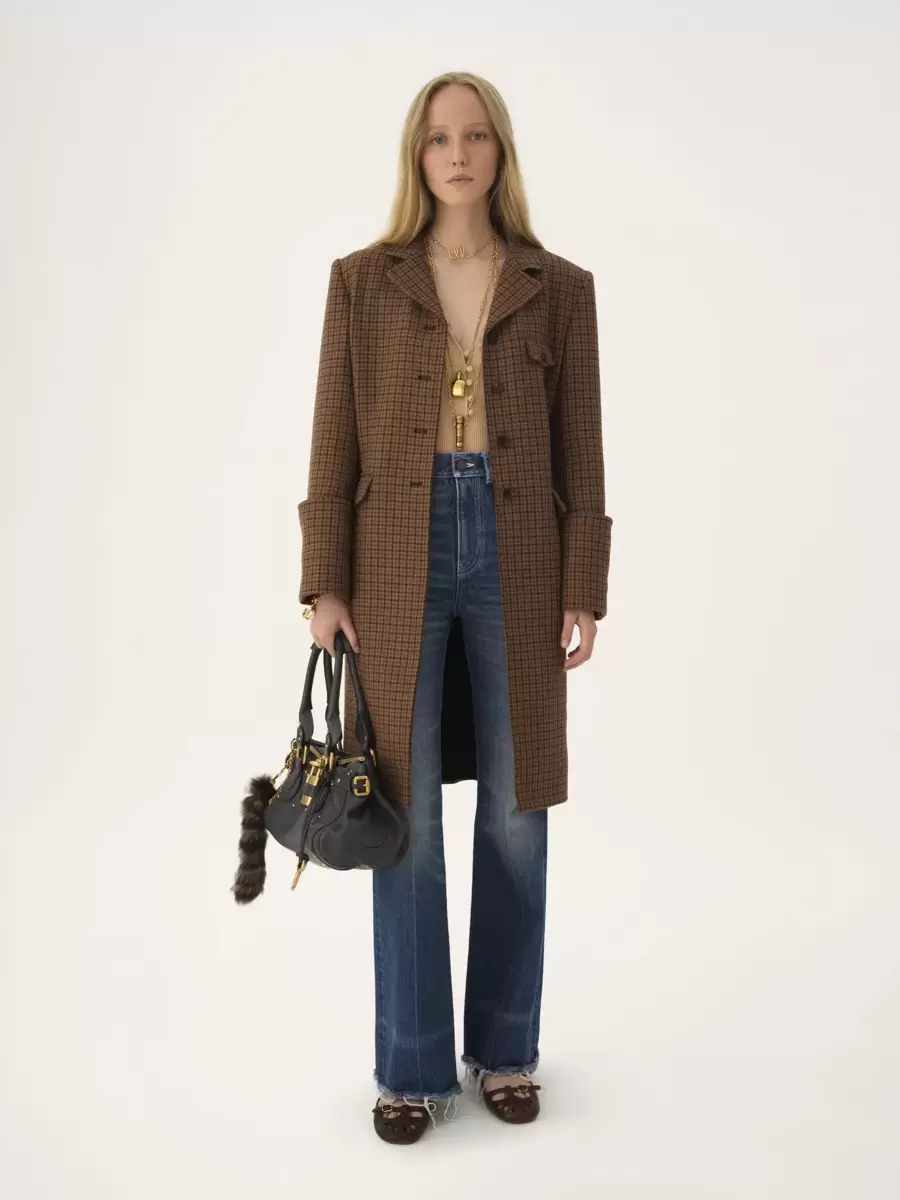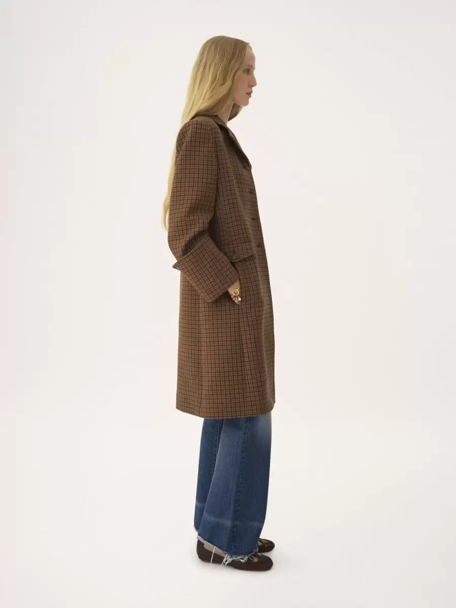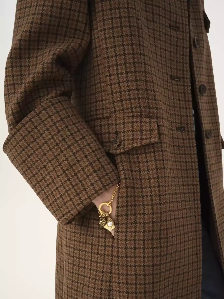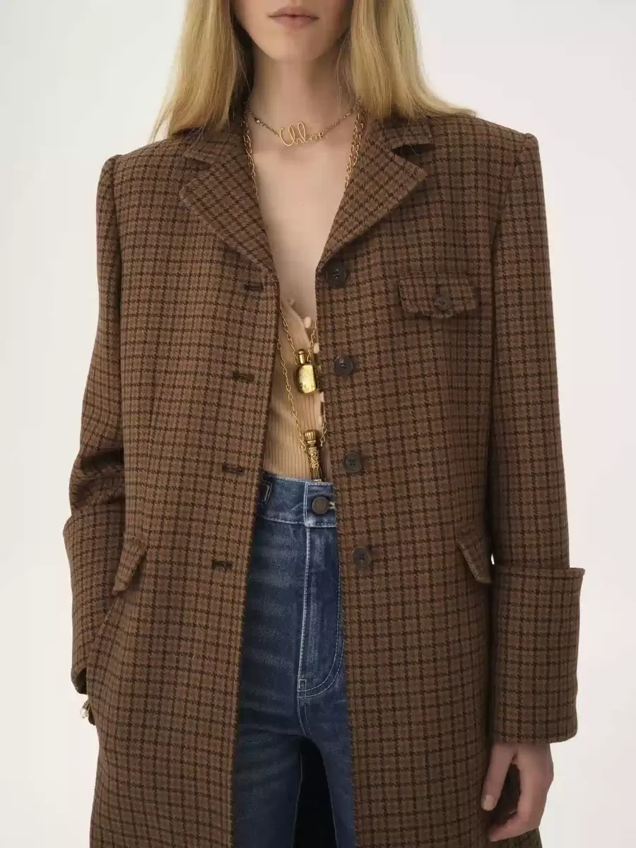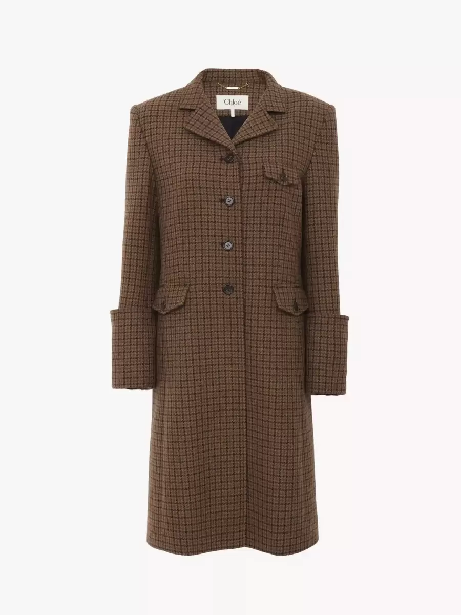 Single-breasted riding coat in lower-impact houndstooth wool, featuring maxi turn-up cuffs, flap pockets and engraved horn buttons.