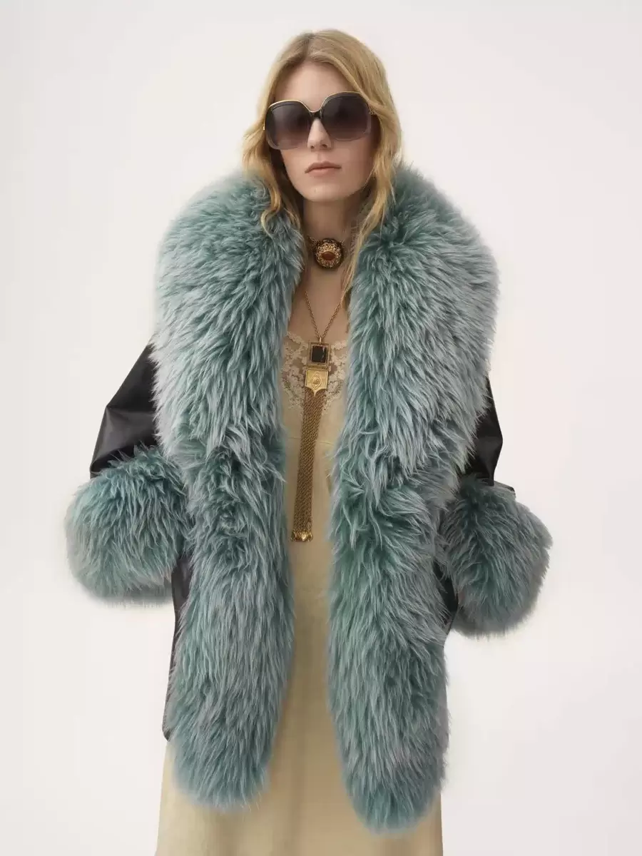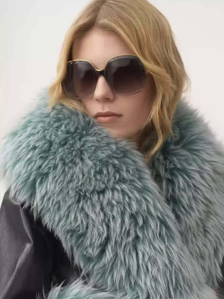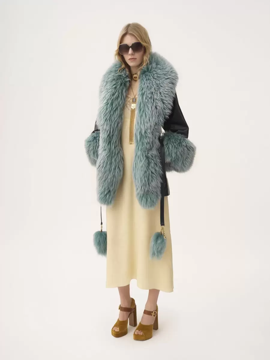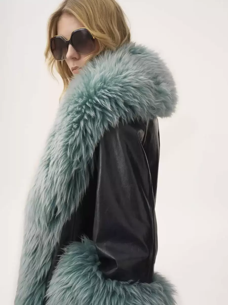 Short coat in shiny cowhide with contrast shearling trims, a tonal leather belt with decorative, gold-tone hardware, and concealed horn buttons.