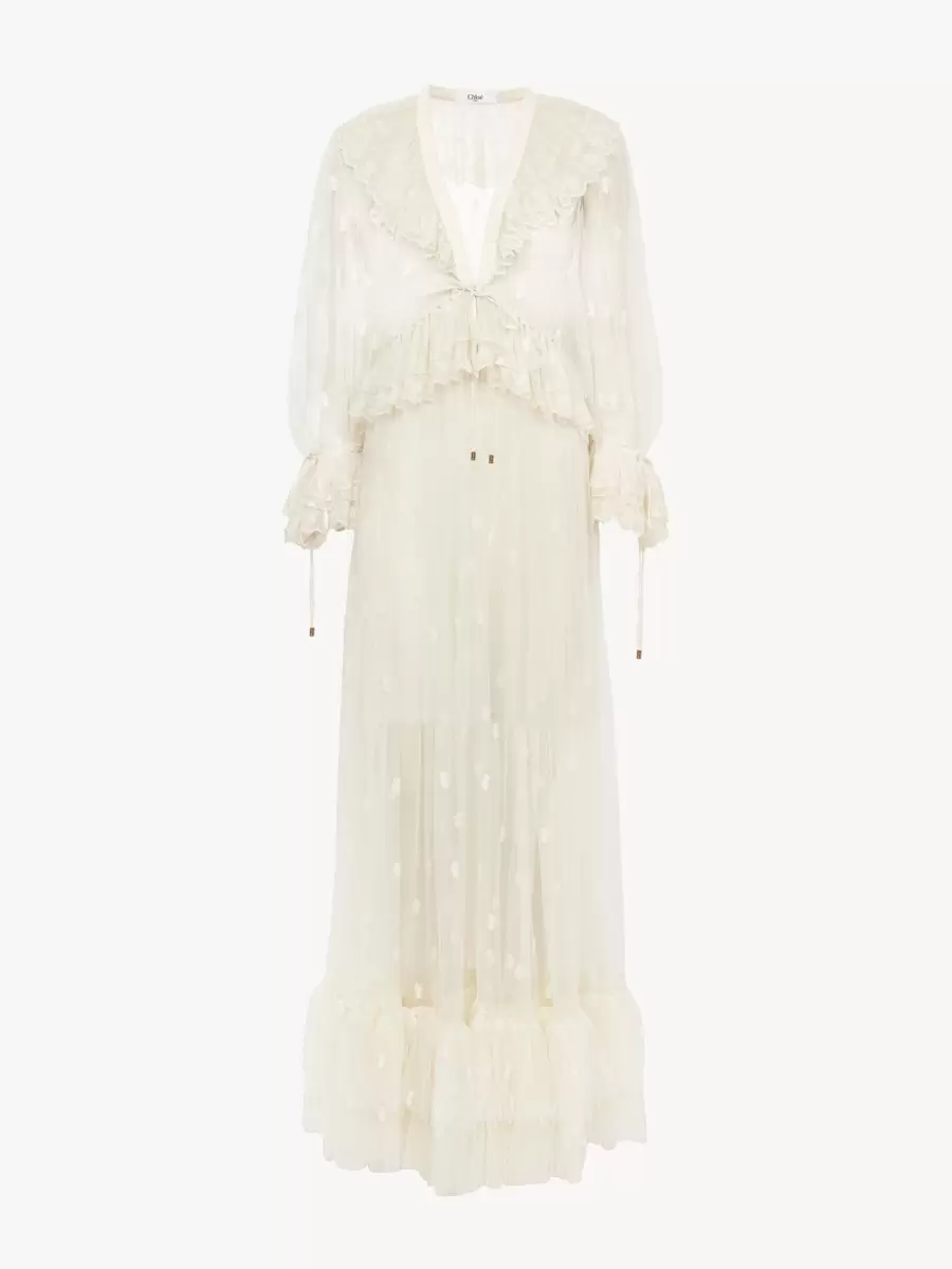Gathered V-neck long dress in embroidered lace rooted in the Maison’s heritage, with a separate dress lining. The ruffle-trim dress features drawstring ties at the waist and cuffs, finished with gold-tone tips.