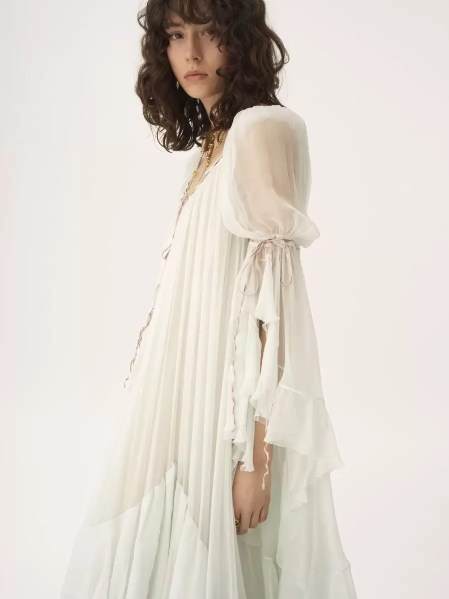 Scoop-neck oversized long ruffled dress in organic silk mousseline with a silk-mix lining, featuring tiered ruffles and drawstring ties.