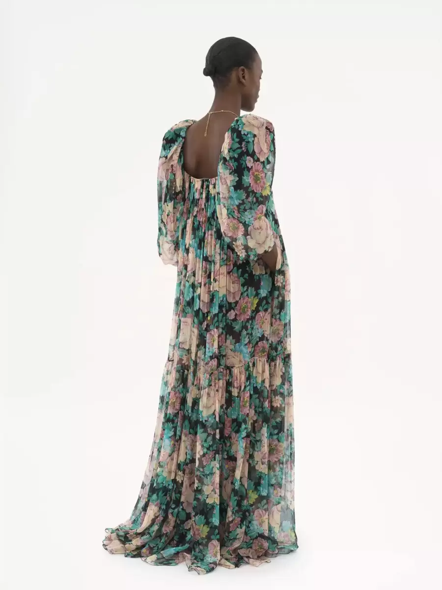 Tiered and gathered puff-sleeve long dress in organic silk mousseline with a silk-mix lining, featuring a floral print inspired by the Maison’s heritage.