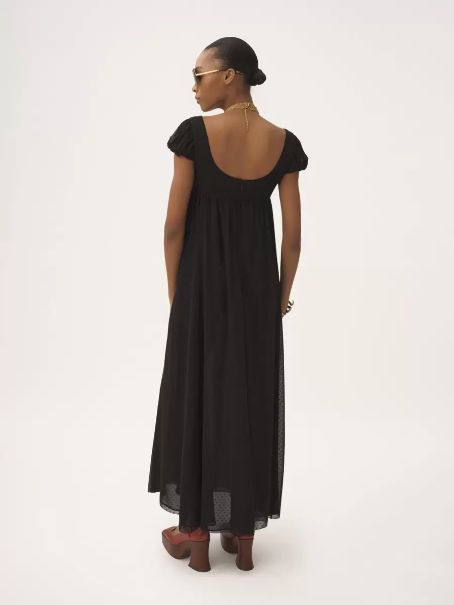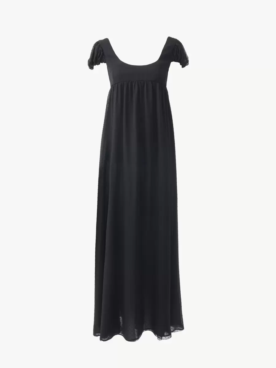 Puff-sleeve long dress in light silk plumetis with a silk-mix lining, combining a scoop-neck top with a fluid skirt gathered at the chest.