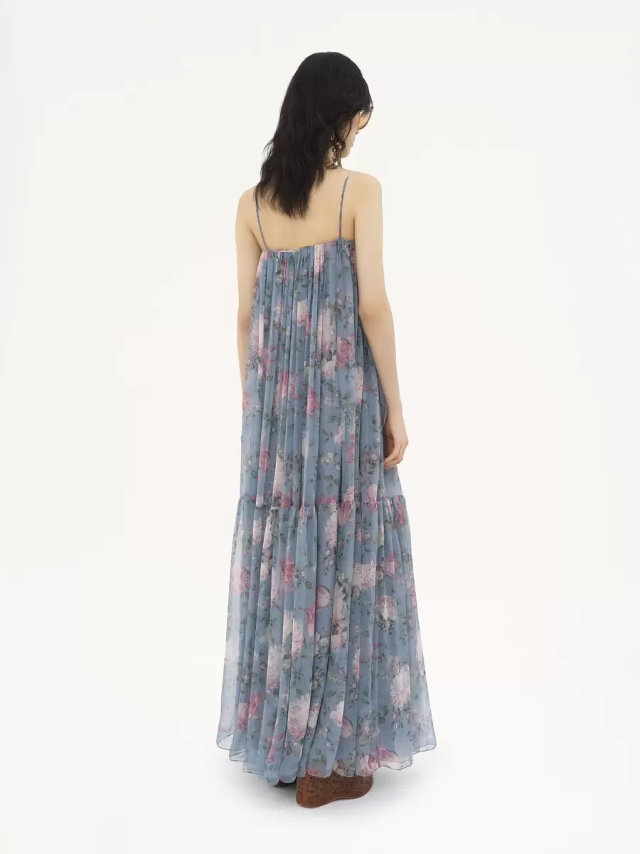 Sleeveless long dress in organic silk mousseline with a silk-mix lining, featuring an all-over peonies print inspired by the Maison’s heritage. Thin straps finish the fluid, tiered silhouette.