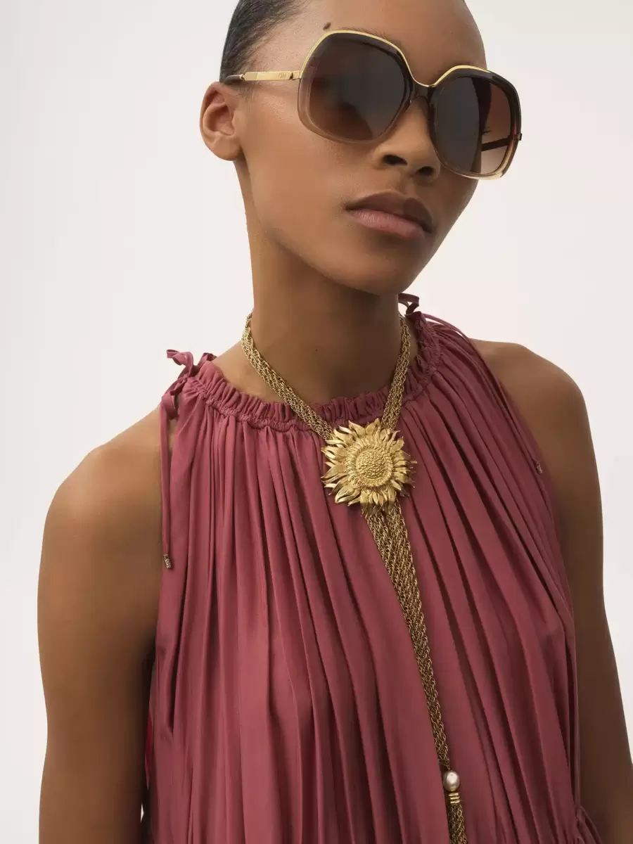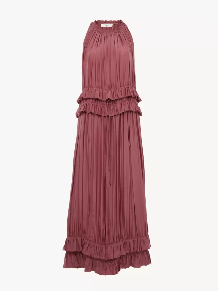 Sleeveless long dress in washed silk pongé with a gathered, tiered silhouette and ruffle trims. The drawstring neck and waist are fastened with dangling ties featuring gold-tone metal tips.