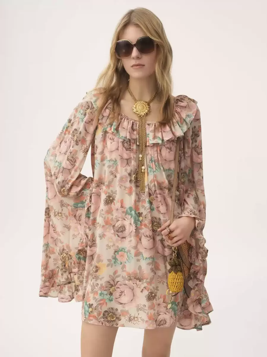 Square-neck ruffled mini dress in organic silk crêpe de chine with a floral print inspired by the Maison’s heritage. The fluid silhouette features flouncy trims at the neck and maxi sleeves.