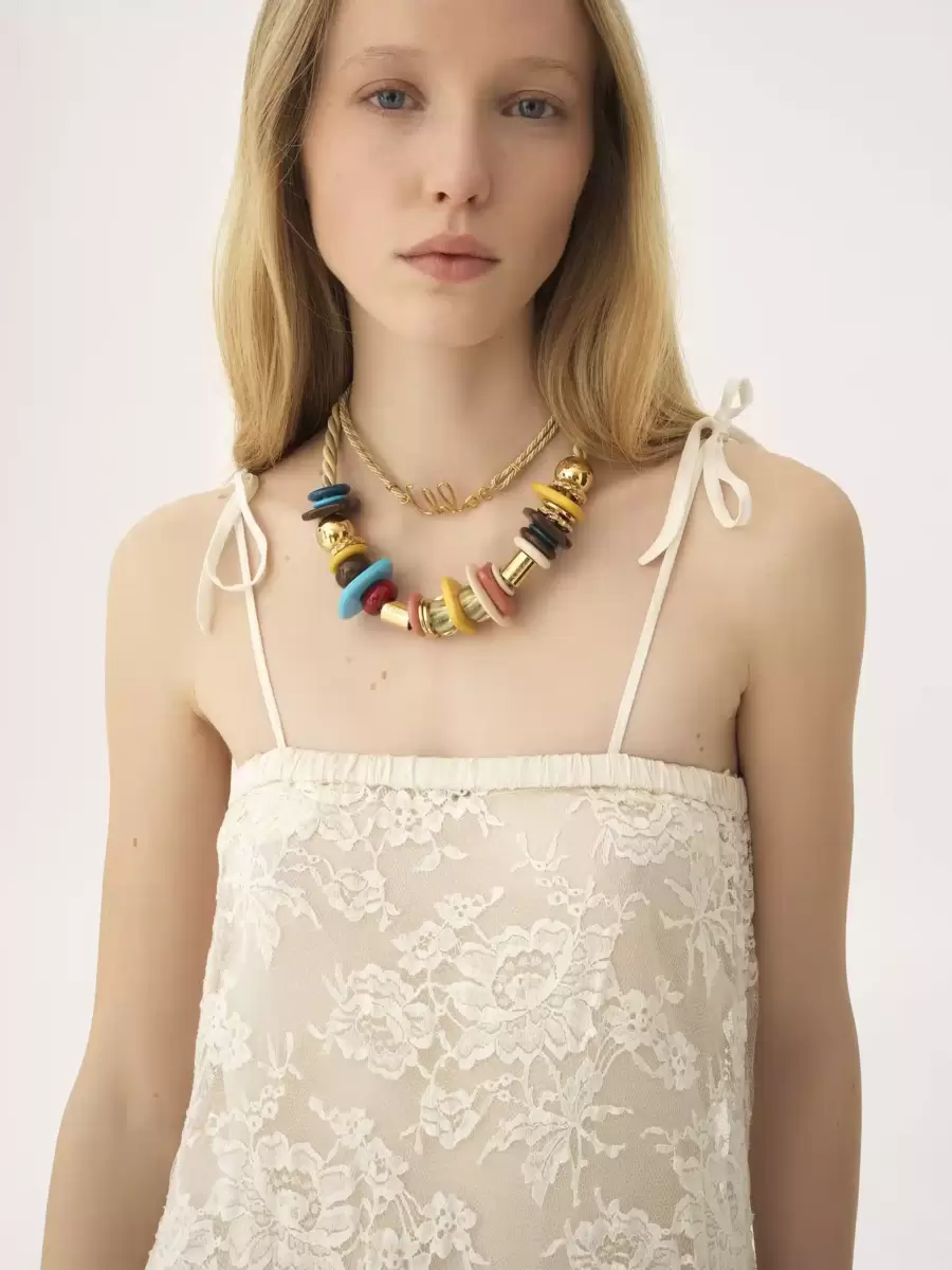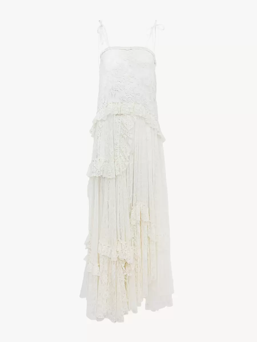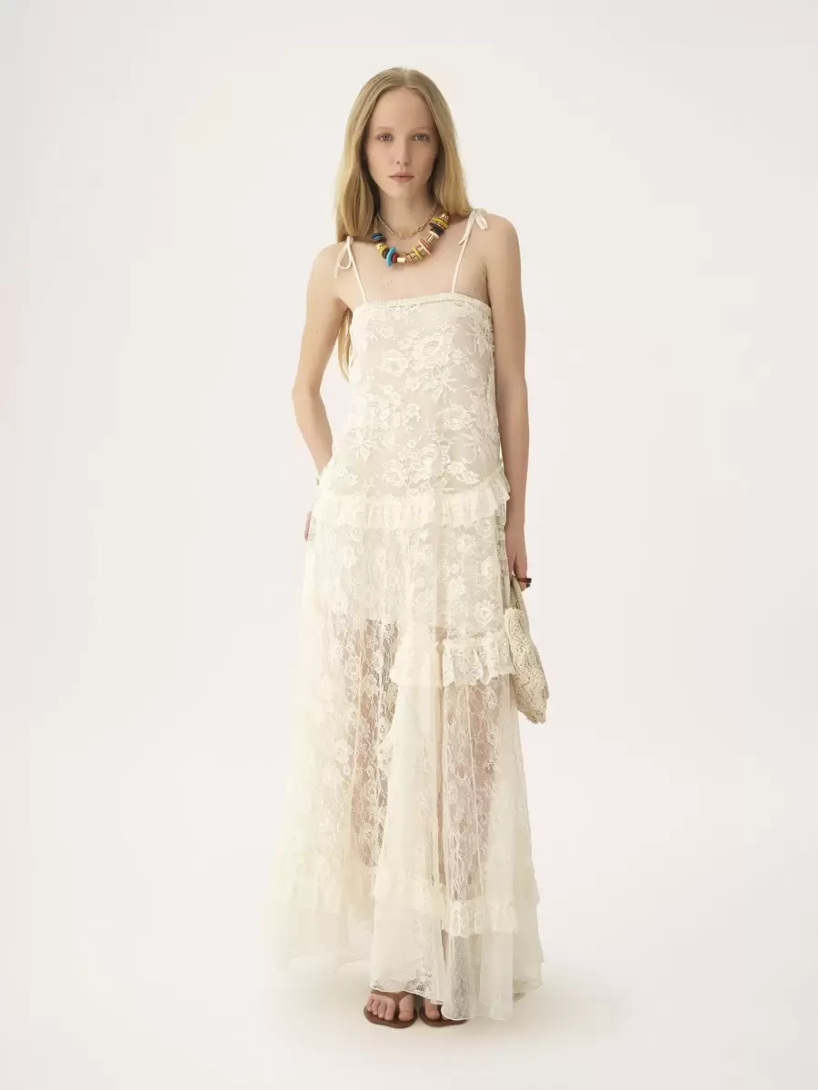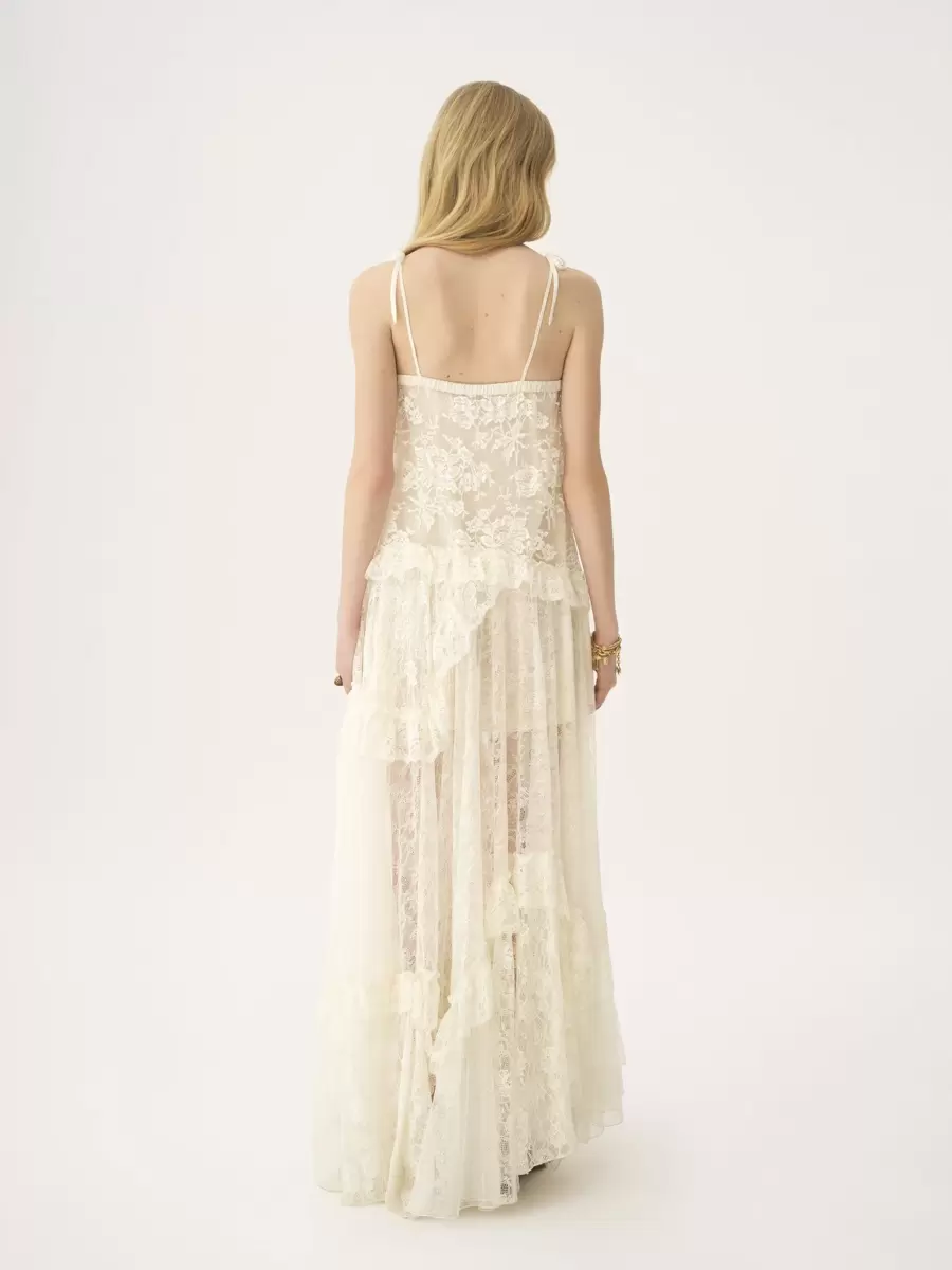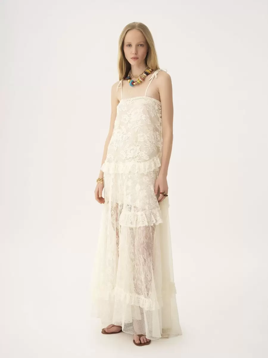 Thin-strap long dress in floral embroidered lace with ruffled trims and a fluid, gathered skirt.