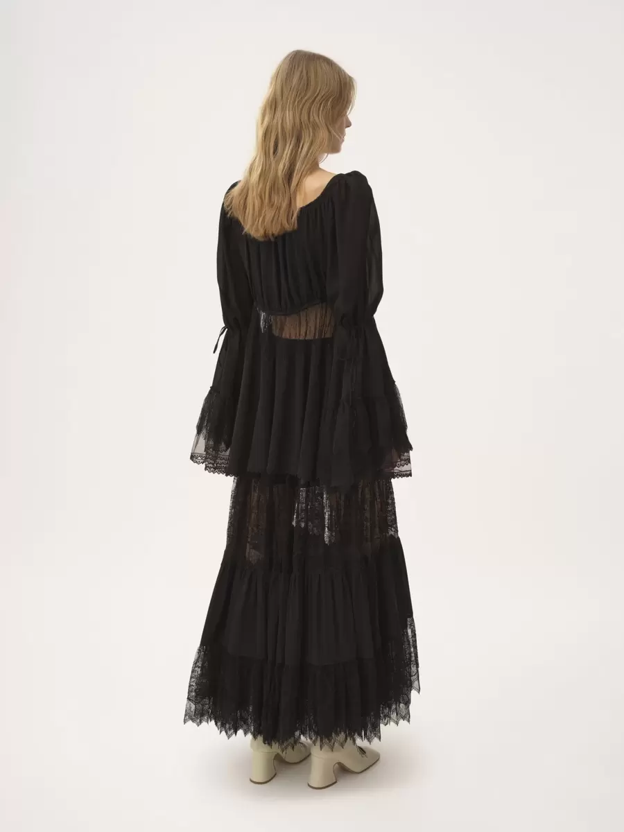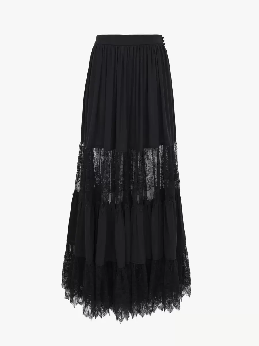 Gathered, tiered long skirt in organic silk georgette with a silk-mix lining, featuring lace inserts at the center and hem. Fabric-covered buttons detail the left side.