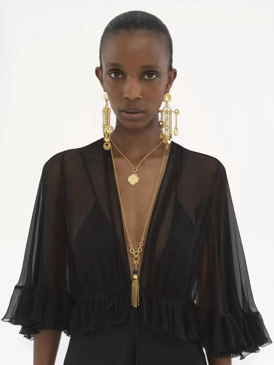 Fluid V-neck long dress in washed crêpe satin with silk-mix lining, featuring gathered details, ruffled trim and dangling ties finished with gold-toned metal tips.