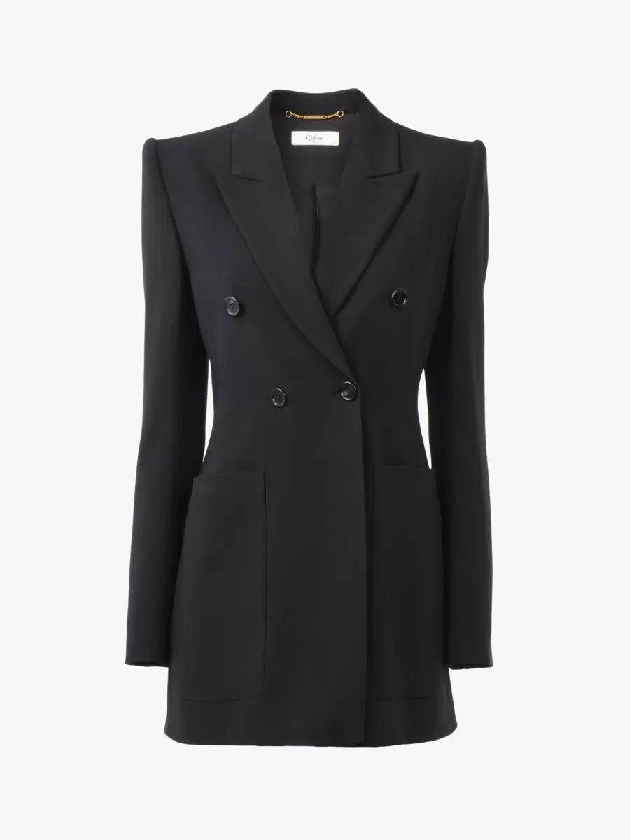 Double-breasted tailored jacket in a soft crêpe mix, featuring oversized front patch pockets and engraved horn buttons.
