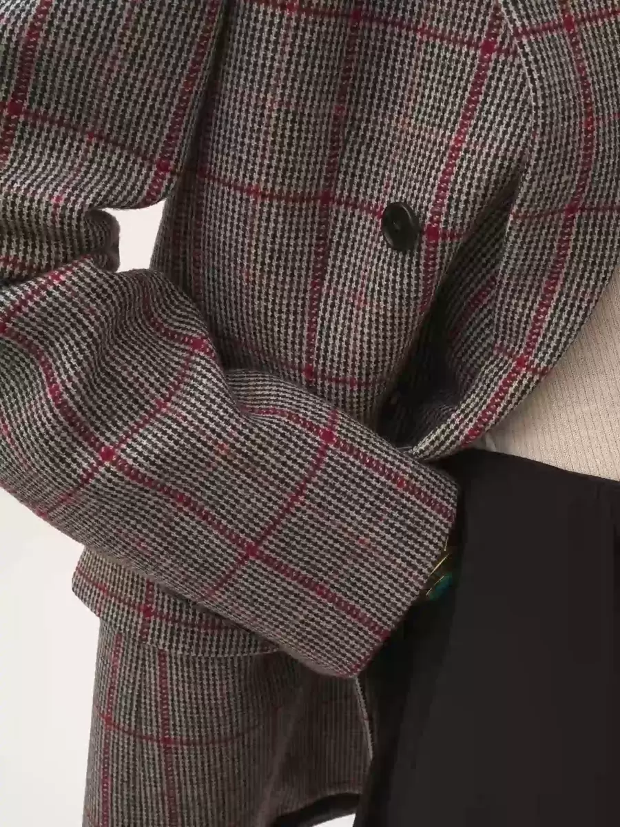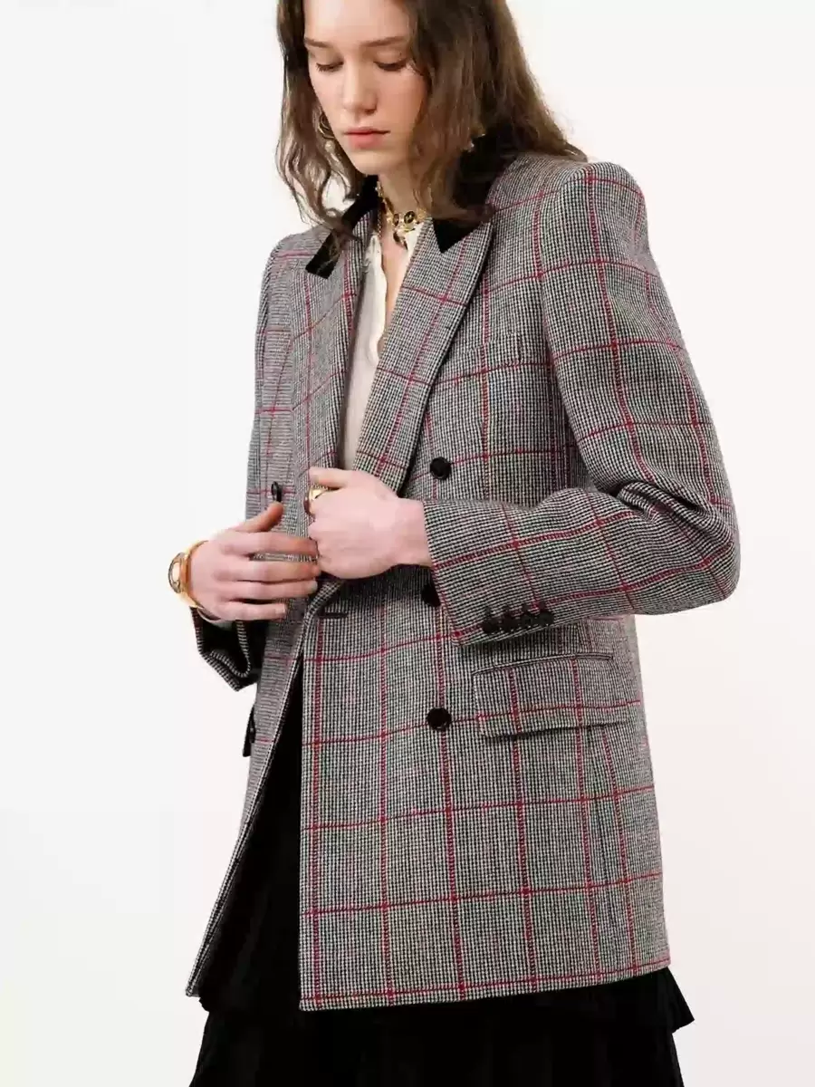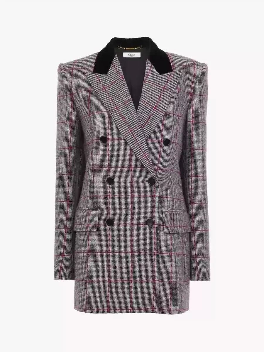 Double-breasted tailored jacket in lower-impact wool check, featuring a contrast velvet collar, front flap pockets and engraved horn buttons.