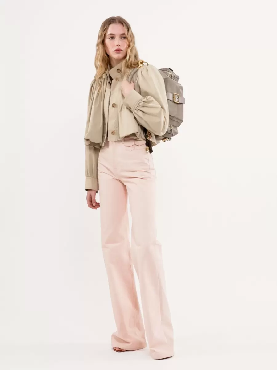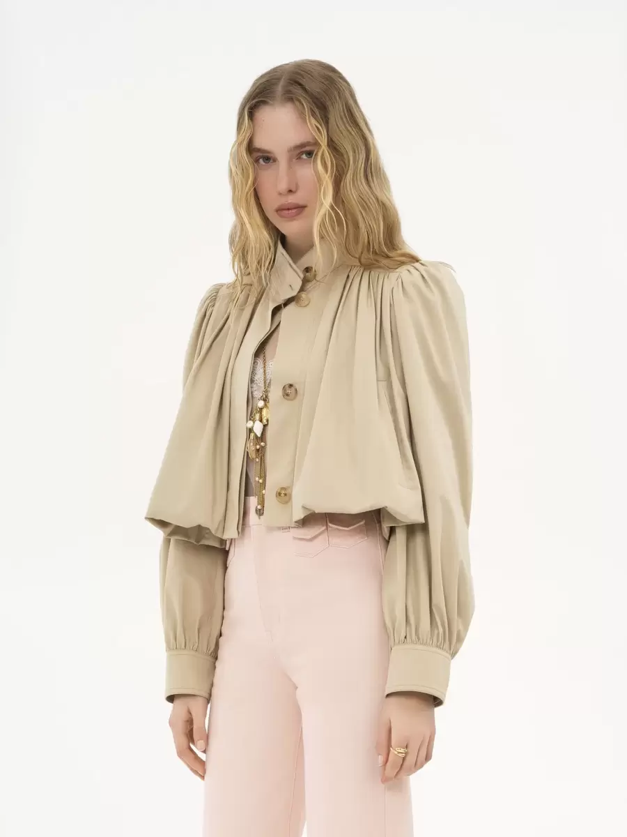 Gathered boule jacket in light organic cotton gabardine with a high collar, gathered shoulders and pleated sleeves. Engraved horn buttons finish this piece.