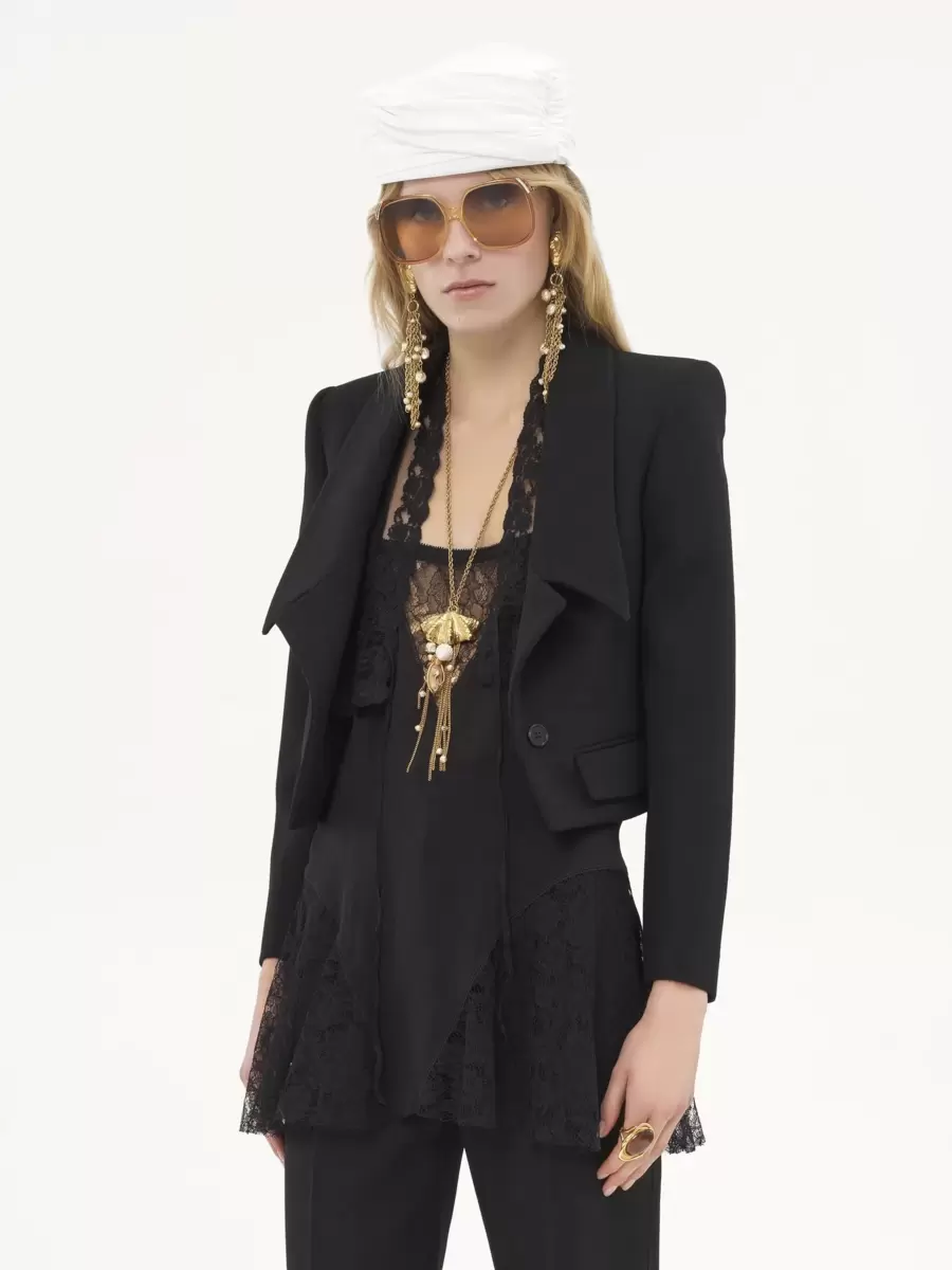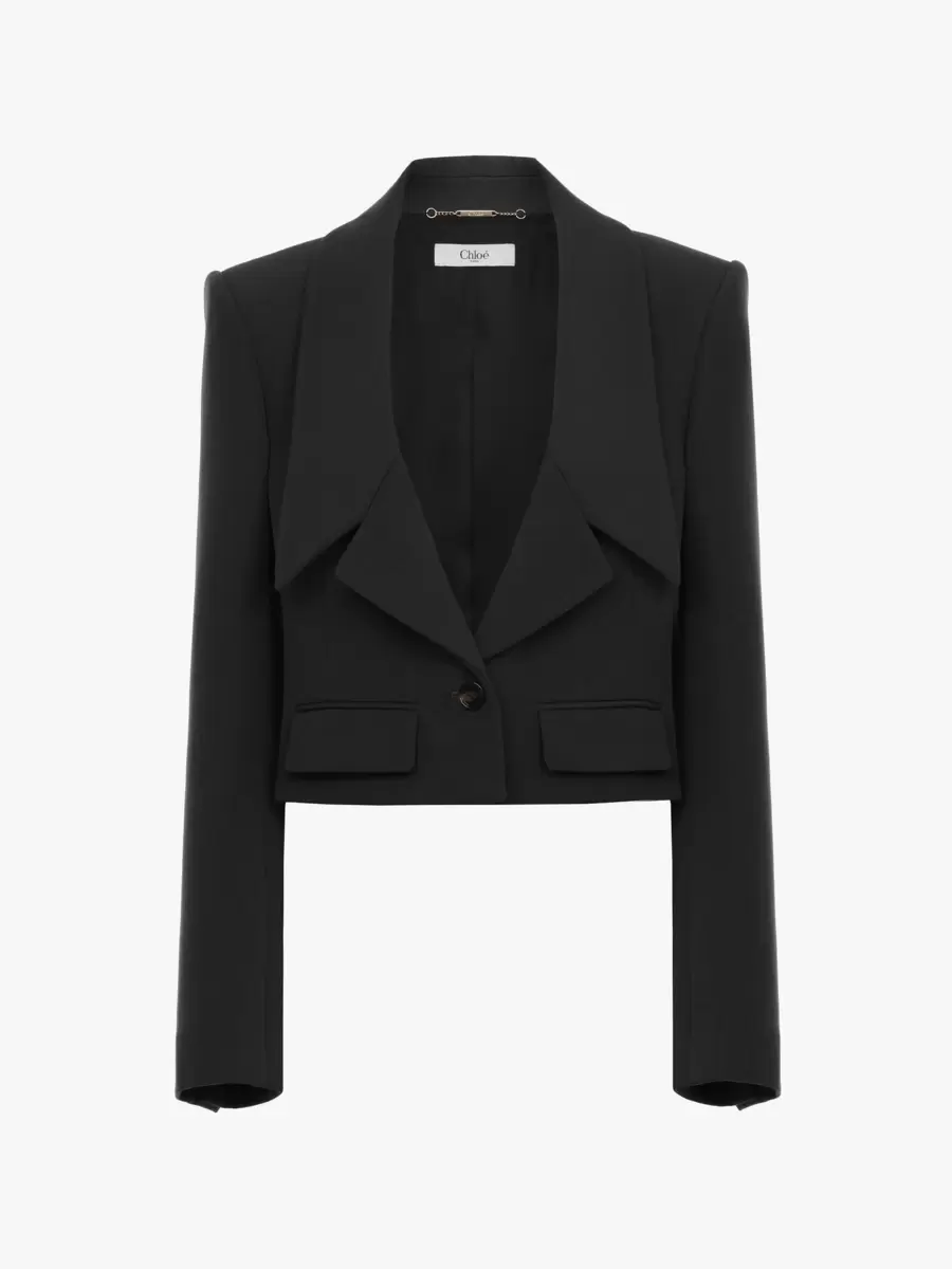 Cropped tailored jacket in lower-impact wool gabardine, inspired by the Maison’s heritage. Mini flap pockets, oversized lapels and engraved horn buttons finish this piece.