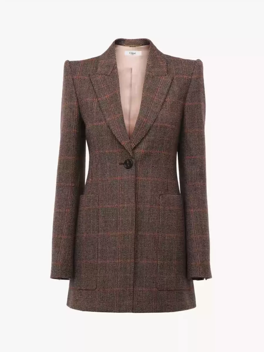 Single-breasted tailored jacket in lower-impact check wool, featuring oversized front patch pockets and an engraved horn button.