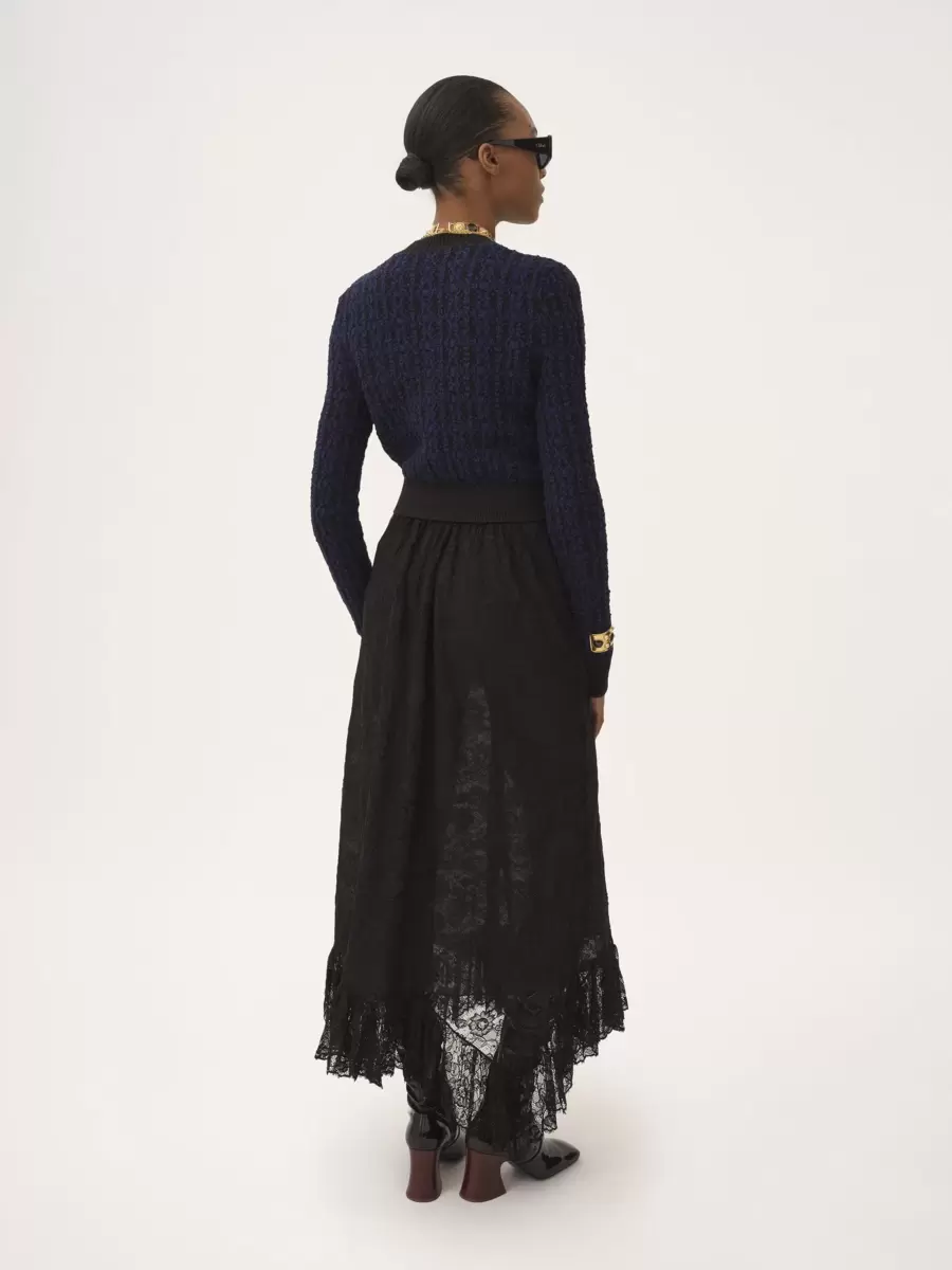 Boxy mock-neck sweater in a textured tweed wool knit, featuring gold-tone buttons at the left shoulder and plain ribbed trims.