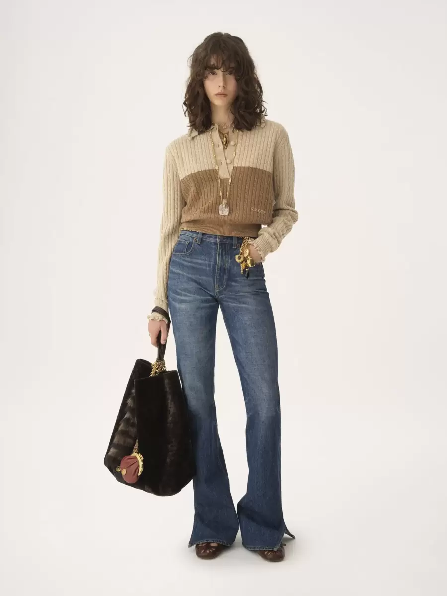 Bicolor collar sweater in a lower-impact wool and cashmere knit, featuring ruffle trims, fabric-covered buttons and Chloé logo embroidery.