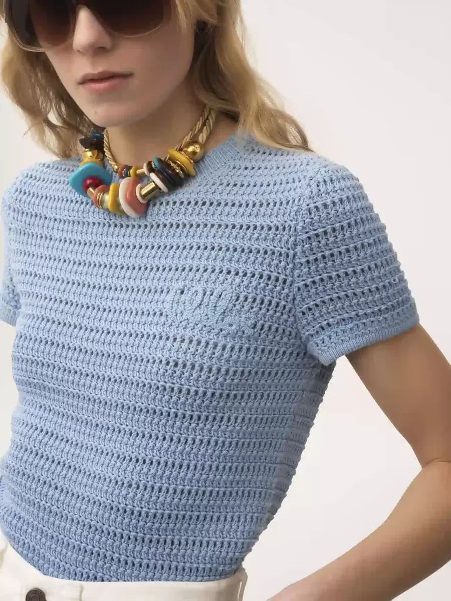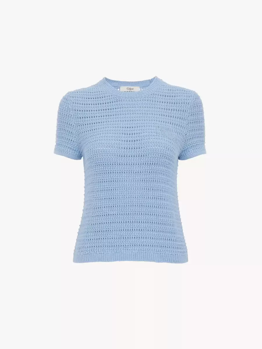 Fitted crew-neck top in organic cotton crochet knit with Chloé logo embroidery at the chest.