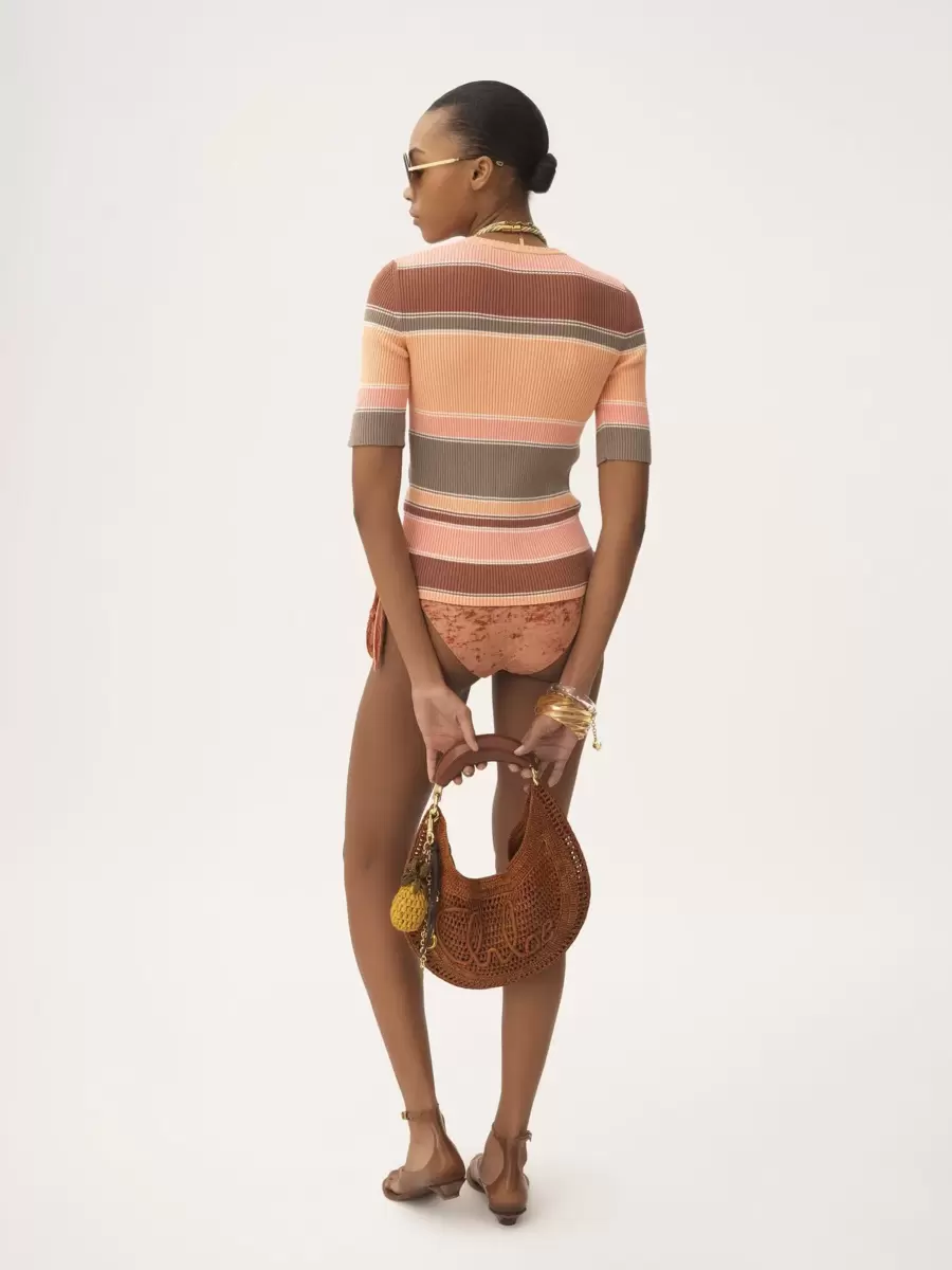 Scoop-neck, elbow-sleeve fitted top in a striped rib knit, signed by subtle Chloé logo embroidery at the chest.