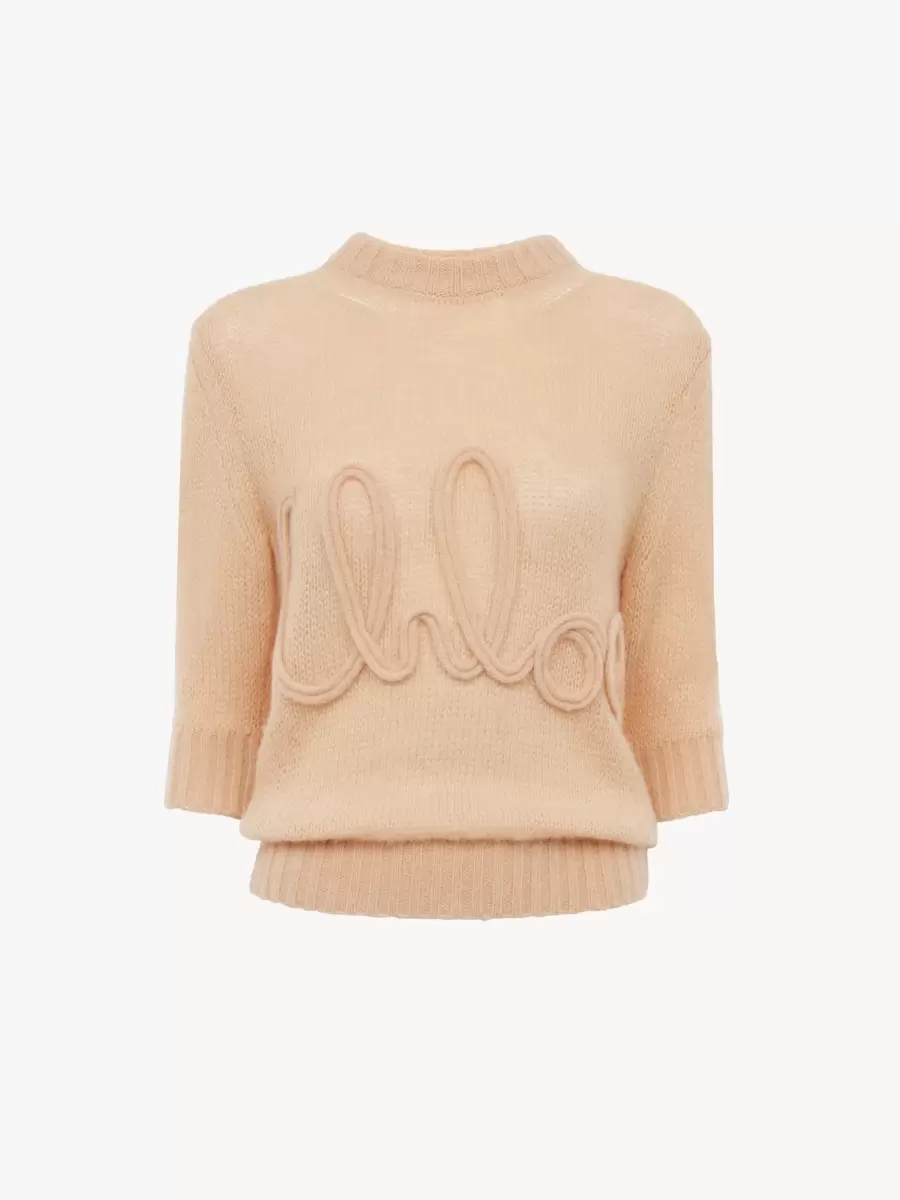 Crew-neck elbow-sleeve sweater in an alpaca wool and silk knit, detailed with ribbed trims and large Chloé logo embroidery at the front.