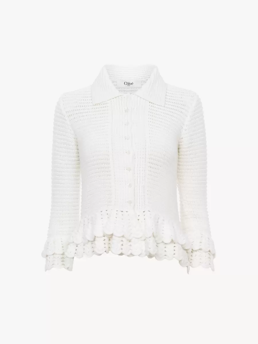 Fitted ruffled cardigan in a crochet knit, featuring mother-of-pearl buttons and layered frills at the hem and cuffs.