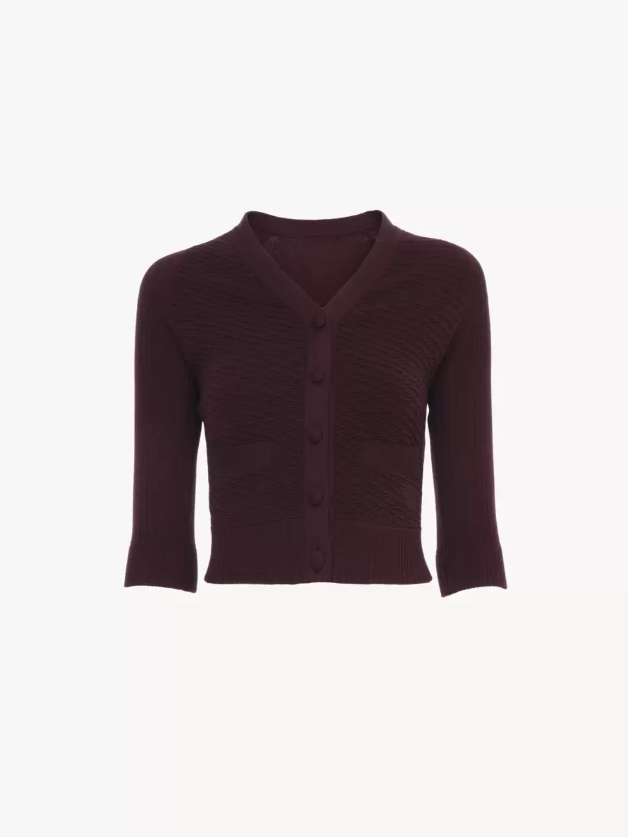 Fitted V-neck cardigan in lower-impact crinkled wool with elbow-length sleeves, featuring fabric-covered buttons, patch pockets and ribbed trims.