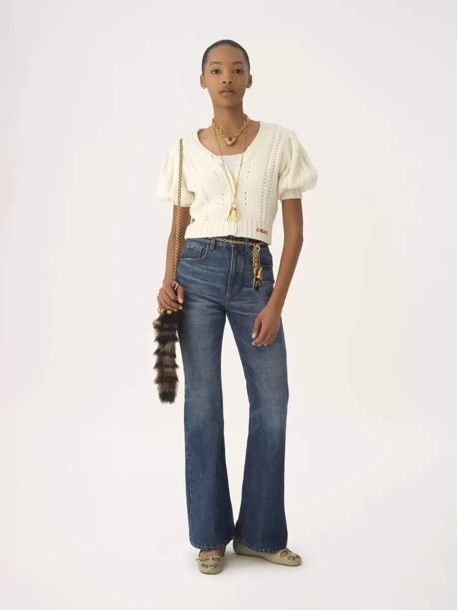 V-neck cardigan in a lower-impact chunky wool and cashmere knit, featuring short puff sleeves, fabric-covered buttons and Chloé logo embroidery at the hem.