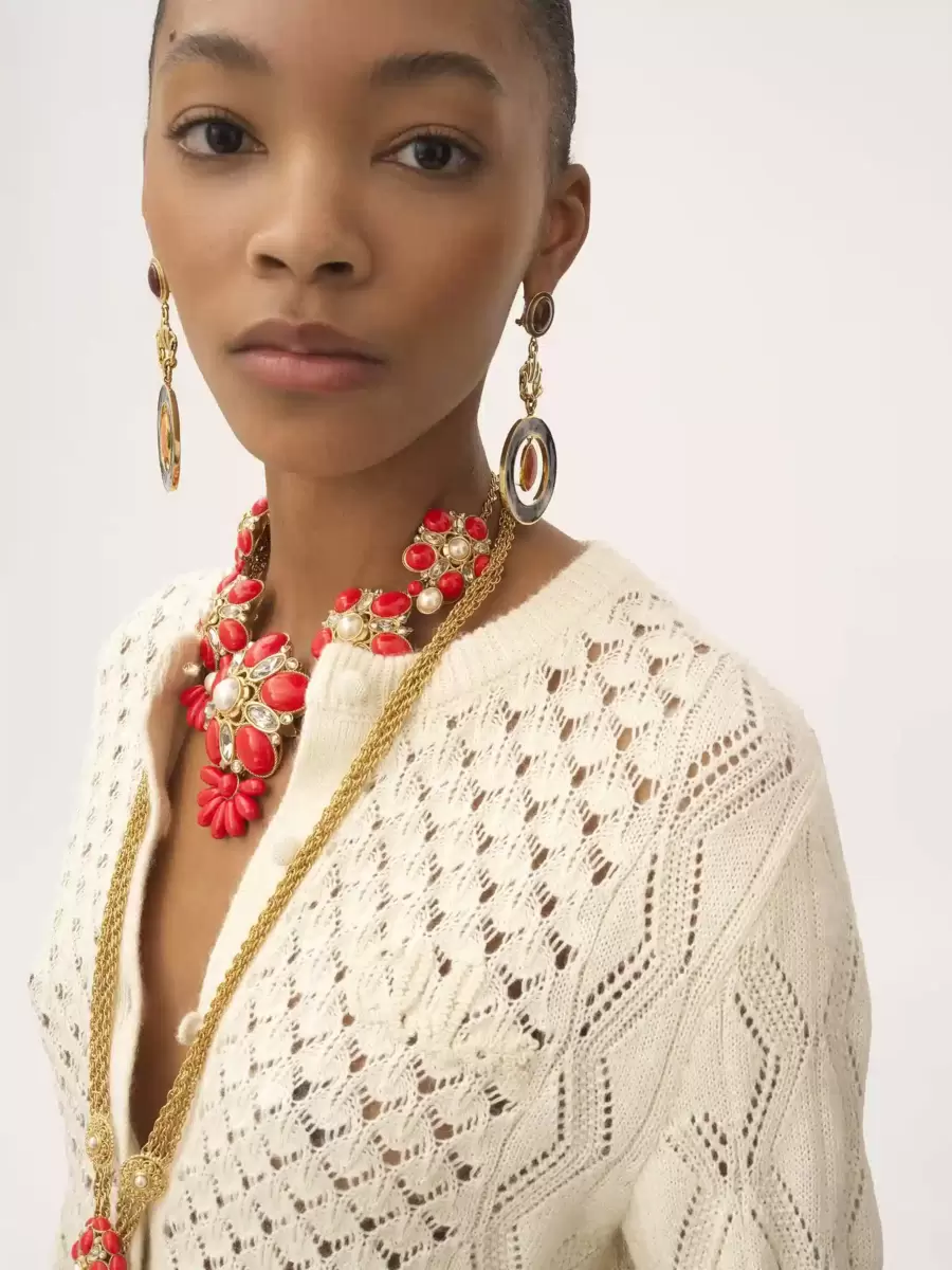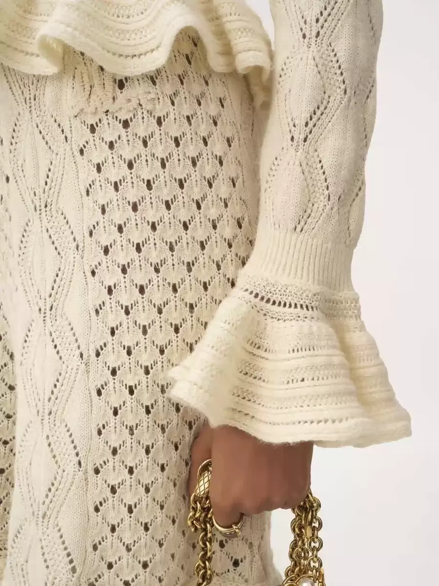 Crew-neck, cropped and ruffled cardigan in a silk, alpaca wool and cotton pointelle knit, featuring a flouncy hem and cuffs. Tonal Chloé logo embroidery and fabric-covered buttons at the front finish this piece.