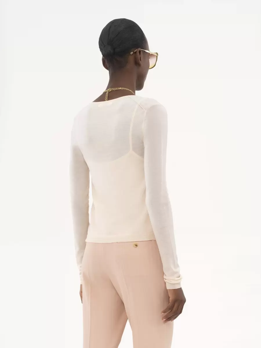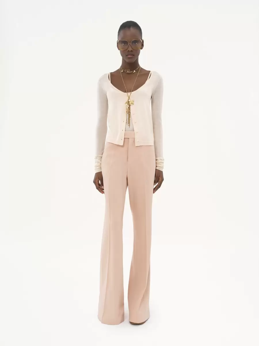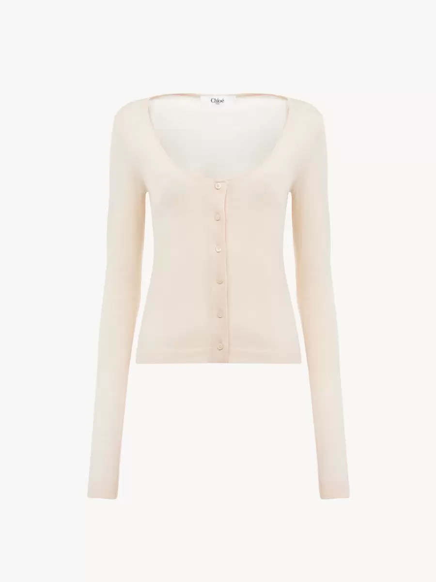 Scoop-neck fitted cardigan in a lower-impact superfine wool ribbed knit, with mother-of-pearl buttons through the front and tonal Chloé logo embroidery at the left hip.
