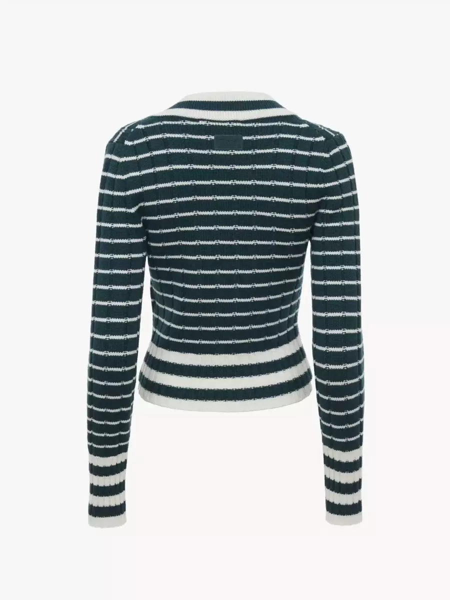 V-neck fitted sweater in a merino wool knit, featuring an interplay of thick and thin stripes.