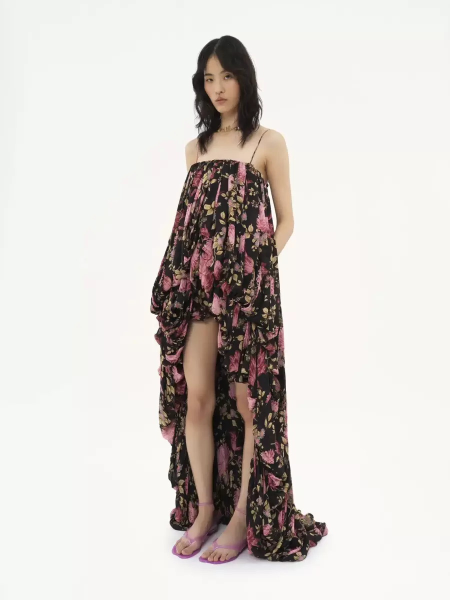 High-low sleeveless jumpsuit in organic silk charmeuse with an all-over floral print rooted in the Maison’s heritage. Thin straps finish the gathered, billowing silhouette.