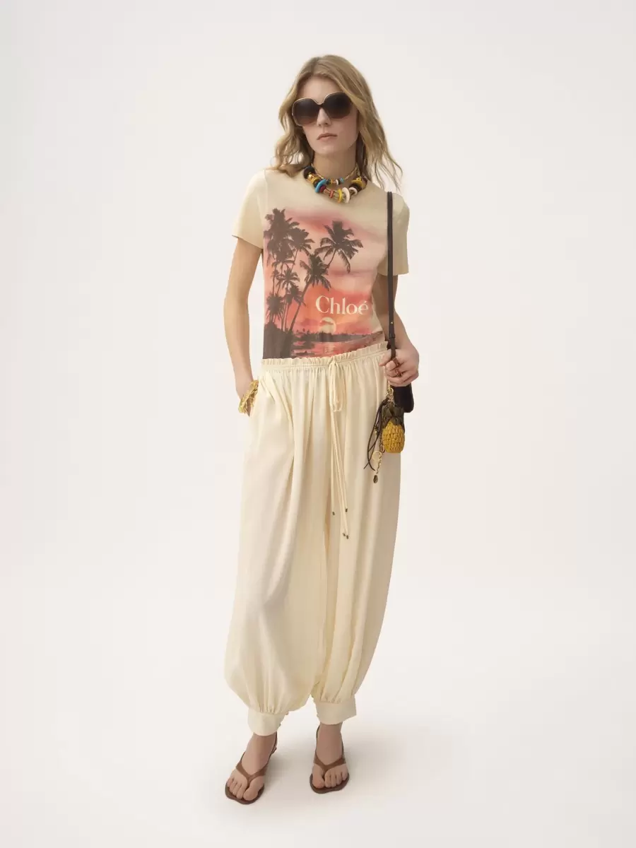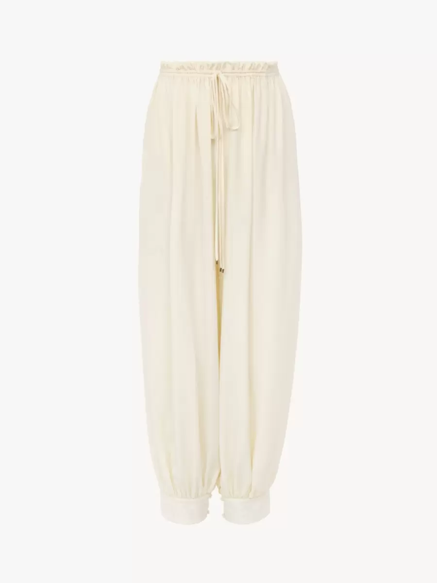 Cropped fluid pants in organic silk crêpe de chine with a silk-mix separate shorts lining. The drawstring waist is detailed with gold-tone metal tips, while tonal embroidery and fabric-covered buttons embellish the hem.